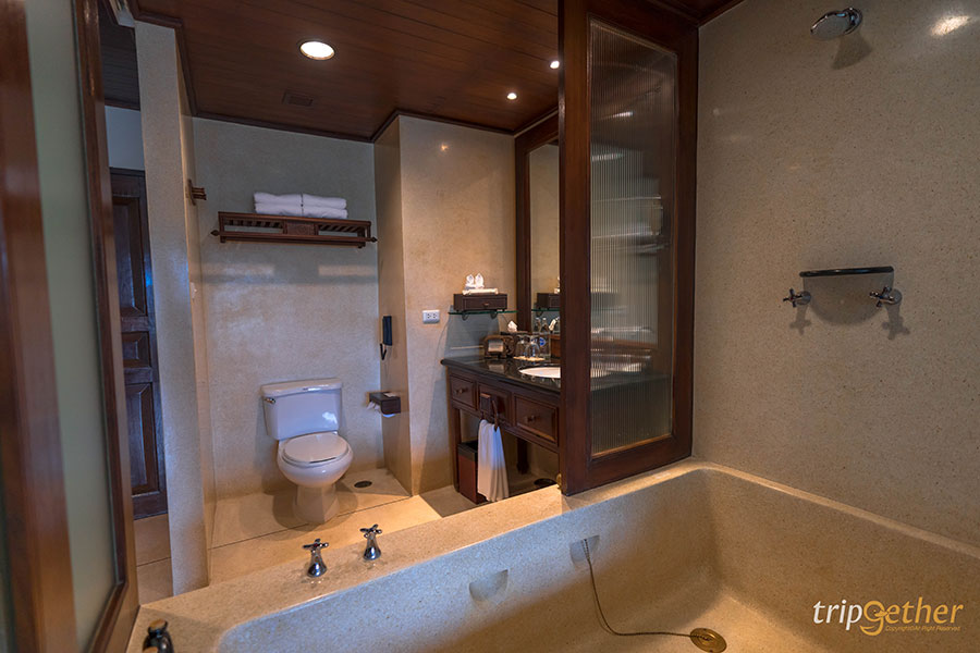 ห้องน้ำจัดสรรพื้นที่โซนเปียกและโซนแห้งเอาไว้ให้อย่างดี มาพร้อมกับอ่างอาบน้ำหินอ่อน ฝักบัวอาบน้ำ เสื้อคลุมอาบน้ำ และผลิตภัณฑ์สปาจากอนันตราสปา เดินทางมาเหนื่อยๆ ก็สามารถนอนแช่น้ำอุ่นแบบส่วนตัวได้สบายๆ