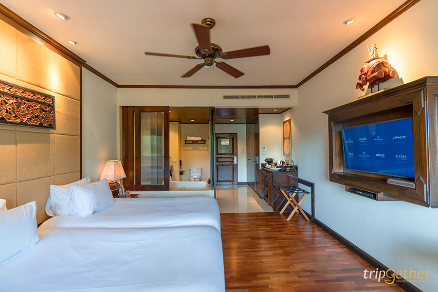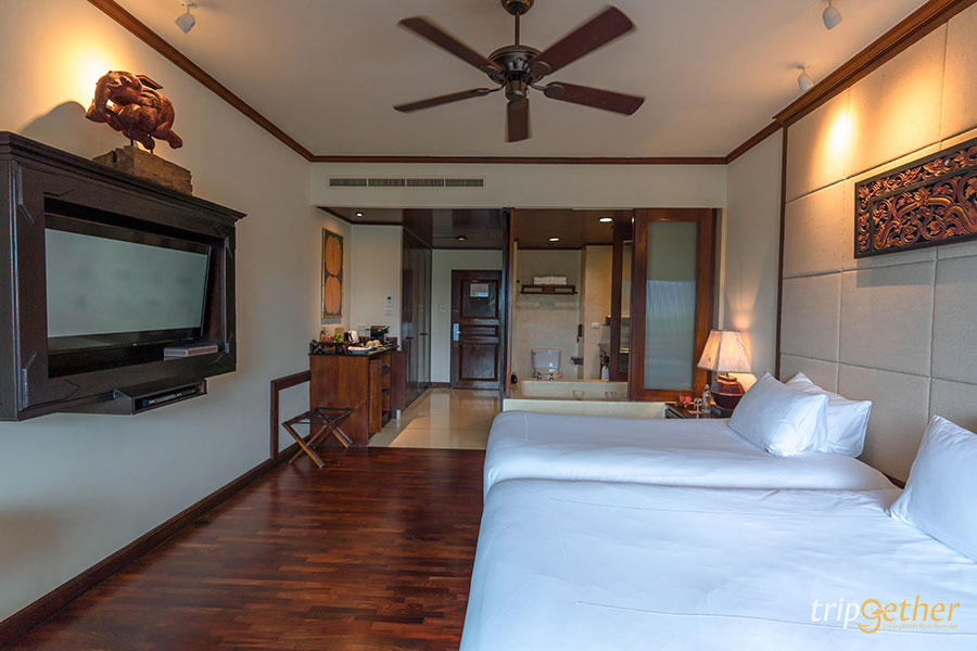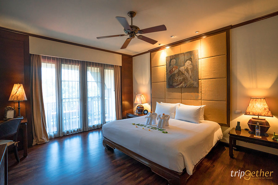 ภายในห้องเน้นการตกแต่งด้วยพื้นไม้สักและเฟอร์นิเจอร์ไม้ให้บรรยากาศอบอุ่นผ่อนคลายผสมผสานด้วยงานศิลปะสุดเรียบง่ายให้เข้ากับบรรยากาศห้องพักเป็นอย่างดี เพียบพร้อมไปด้วยเตียงนอนหนานุ่ม โทรทัศน์ เครื่องปรับอากาศ และมินิบาร์