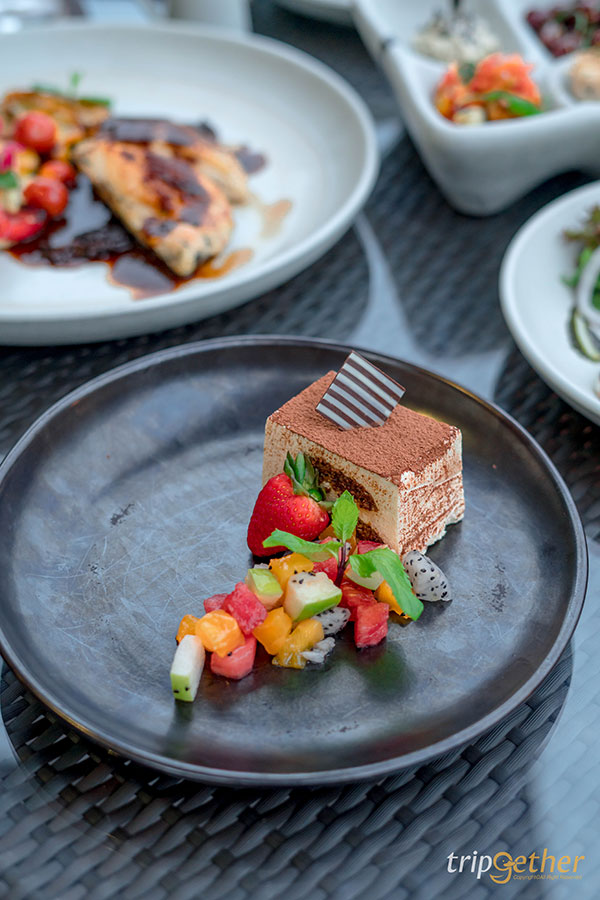 ปิดท้ายด้วยของหวานอย่าง เค้กทิรามิสุ เสิร์ฟพร้อมผลไม้สดรสชาติเข้ากันเป็นอย่างดี