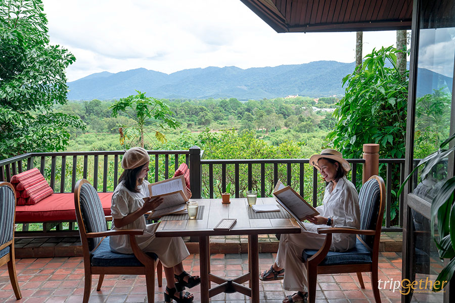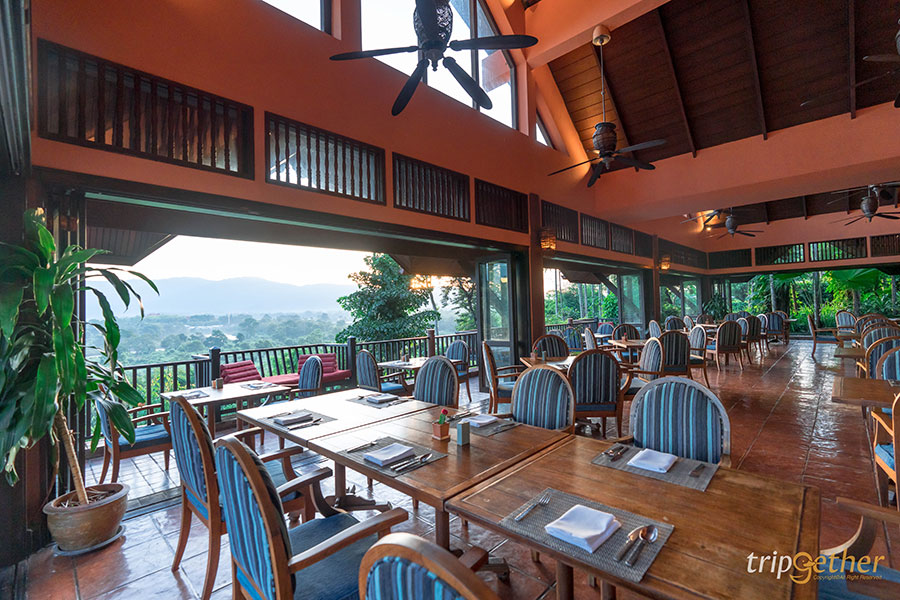 ภายในห้องอาหารกว้างขวาง พร้อมจัดสรรพื้นที่เอาไว้อย่างดี สามารถเลือกนั่งได้ทั้งโซนโอเพ่นแอร์และโซนเอาท์ดอร์ มีทิวทัศน์ของแม่น้ำและขุนเขาเอาไว้ให้ชมได้แบบพาโนรามา