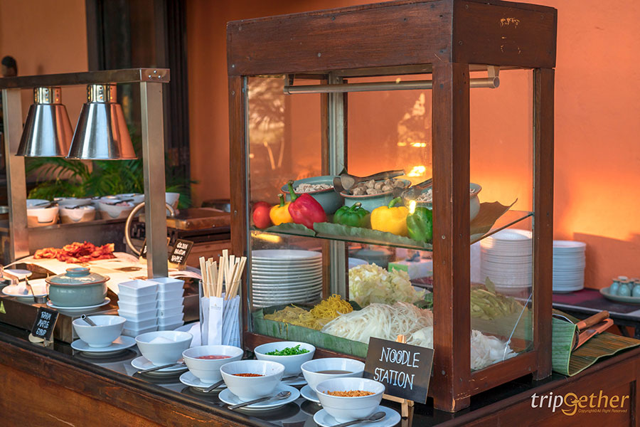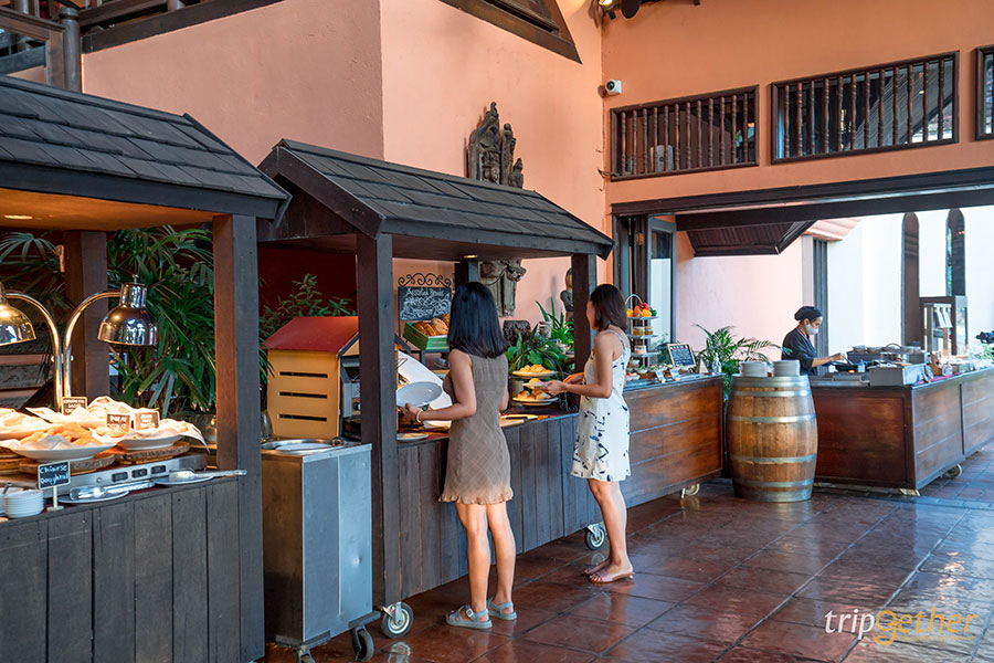 เสิร์ฟอาหารกันแบบบุฟเฟ่ต์มีอาหารให้เลือกสรรอย่างหลากหลายทั้ง ข้าวต้ม ก๋วยเตี๋ยว American Breakfast น้ำผลไม้คั้นสด และอาหารนานาชาติ