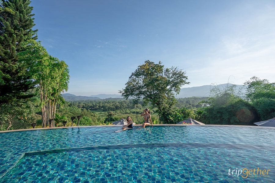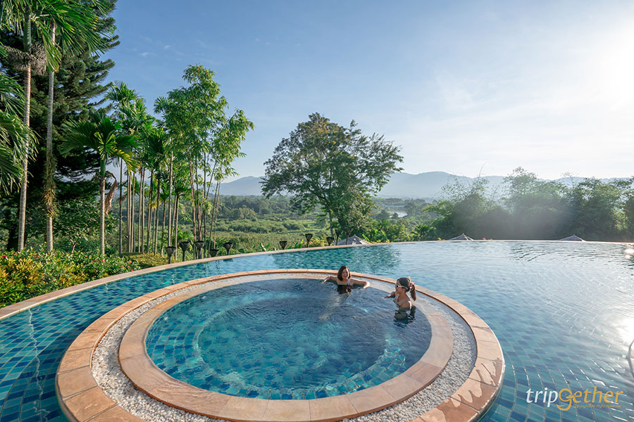 สระว่ายน้ำวิวเขาจัดสรรมุมแช่น้ำเอาไว้ให้อย่างดี ถ้าอยากว่ายน้ำออกกำลังกายที่นี่ก็จัดแบ่งโซนเอาไว้ให้อีกด้วย