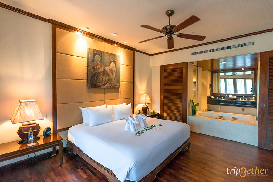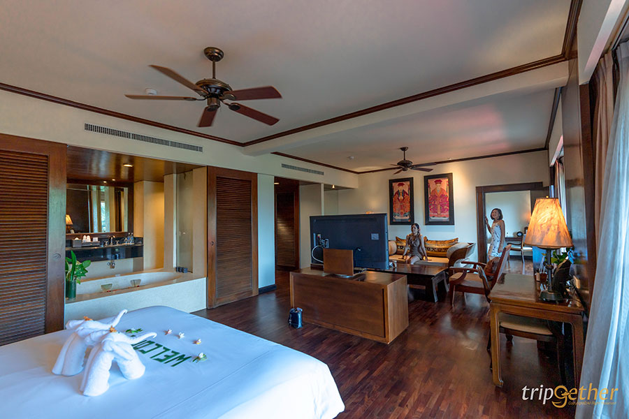 ภายในแบ่งสัดส่วนทั้งพื้นที่นั่งเล่นและพื้นที่ห้องนอนเอาไว้อย่างลงตัว มาพร้อมสิ่งอำนวยความสะดวกครบครันทั้ง เครื่องปรับอากาศ ชุดเครื่องนอนผ้าลินินสีขาวสุดสอาดตา เสื้อคลุม รองเท้าแตะ ไดร์เป่าผม และมินิบาร์ฟรีทุกวันที่เลือกสรรมาให้เป็นอย่างดีเสมือนอยู่บ้าน