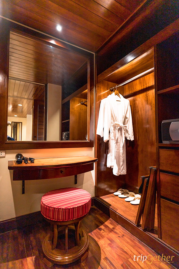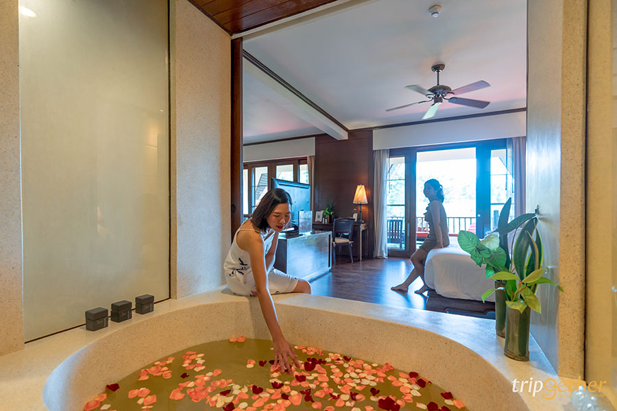 และพลาดไม่ได้กับมุมห้องน้ำที่จัดสรรพื้นที่โซนเปียกและโซนแห้งเอาไว้อย่างดี รองรับผู้เข้าพักเป็นคู่หนุ่มสาวด้วยอ่างอาบน้ำหินขัด พร้อมประตูกระจกบานใหญ่สามารถเปิด-ปิดได้ตามต้องการ มีห้องแต่งตัวและโต๊ะเครื่องแป้งแยกเอาไว้ให้ใช้งานได้เหมือนอยู่ที่บ้าน