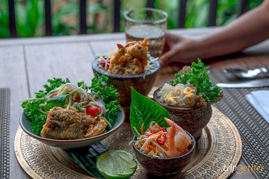 ตามมาด้วยเมนู สลัดรวมรส เสิร์ฟอาหารเป็นชุดส้มตำปูนิ่มทอด ยำมะม่วงกับปลาทับทิมทอด ยำส้มโอ และส้มตำฝรั่งกุ้ง