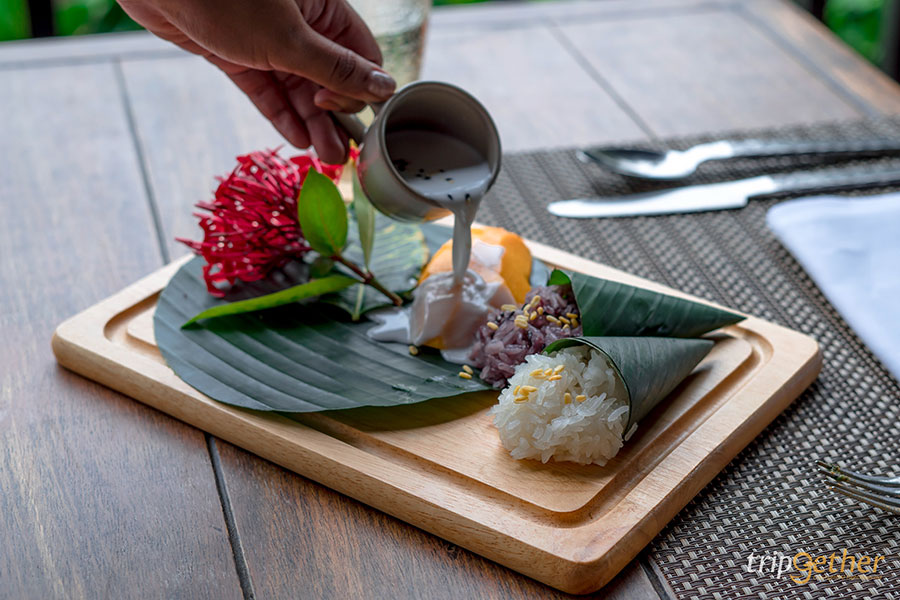 ปิดท้ายด้วยของหวาน ข้าวเหนียวมะม่วง เสิร์ฟมะม่วงหวานฉ่ำ พร้อมข้าวเหนียวสองสีและน้ำกะทิรสชาติกลมกล่อม