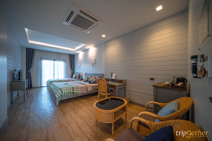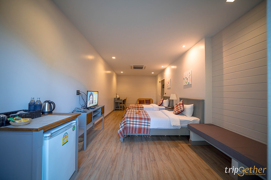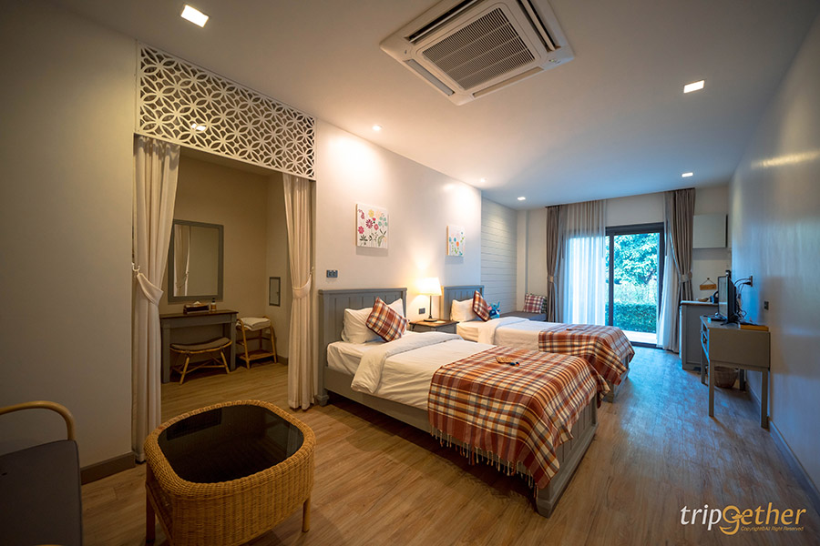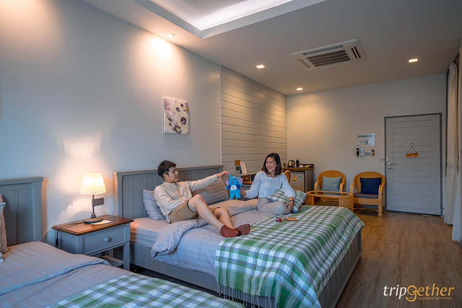 สำหรับห้องพักที่นี่แบ่งออกเป็น 3 แบบหลักๆ คือ Deluxe, Triple / Family และ Villa ซึ่ง 2 แบบแรก ที่เราจะมาแนะนำก็คือ Deluxe และ Triple / Family ทั้ง 2 แบบนี้ เป็นห้องพักบนตึก เหมาะสำหรับกลุ่มเพื่อนและครอบครัว