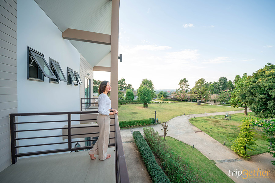แถมมีระเบียงห้อง ให้ออกมาเดินและนั่งเล่นสูดอากาศดีๆ ยามเช้าอีกด้วย