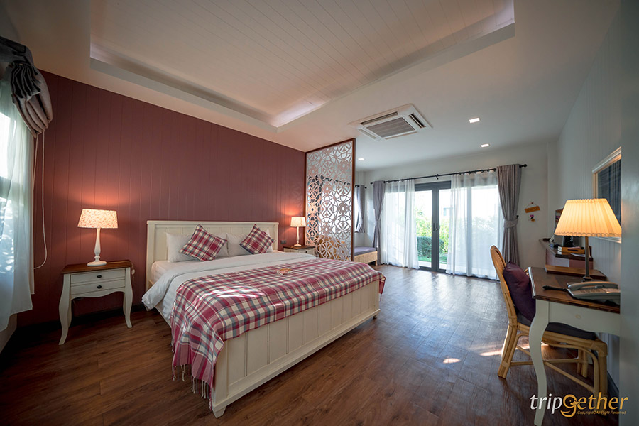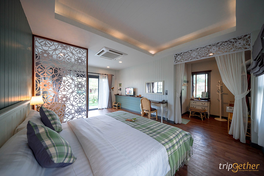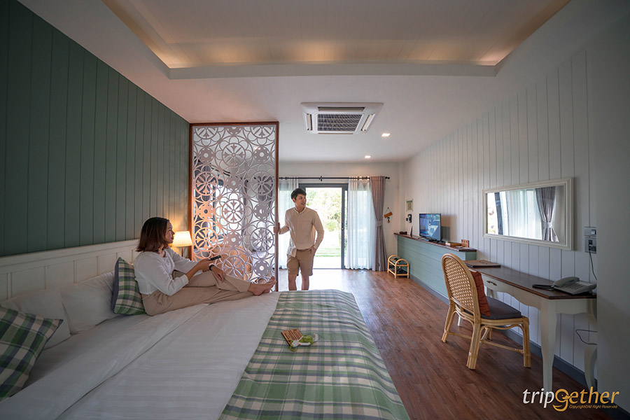ภายในห้องกว้างขวางมาพร้อมกับ เตียงคิงไซส์ และมุมพักผ่อน พร้อมเฟอร์นิเจอร์ และสิ่งอำนวยความสะดวกครบครัน ตกแต่งอย่างมีเอกลักษณ์ โดยผสมผสานความทันสมัยให้เข้ากับลวดลายพื้นถิ่นได้อย่างลงตัว เหมาะสำหรับคู่รักที่อย่างมาพักผ่อน ในพื้นที่ที่มีความสะดวกสบายแบบเป็นส่วนตัว