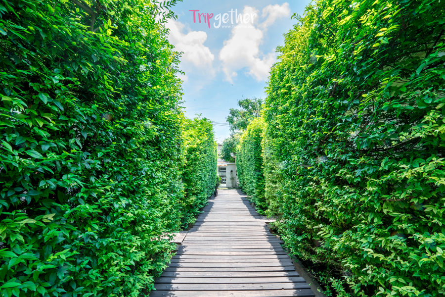 ภายในก็มีความร่มรื่นเพราะมีการตกแต่งต้นไม้เป็นพุ่มไว้ตลอดทางเดิน โดยพุ่มไม้จะอยู่หน้าบ้านพัก ให้ความสงบ ร่มรื่น