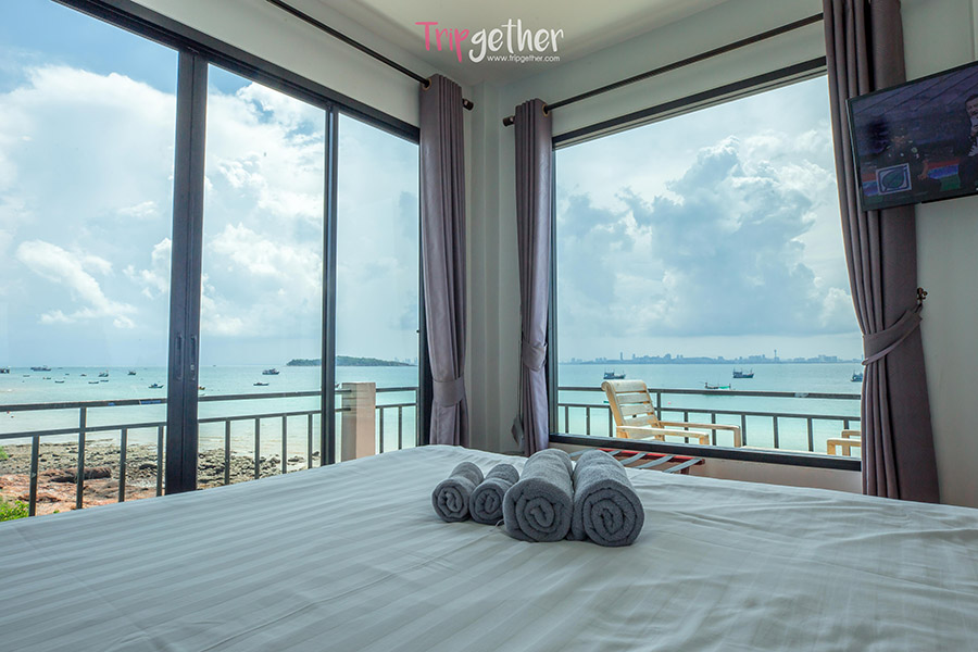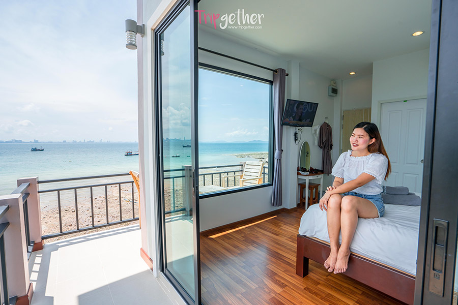 บ้านทะเลน้ำใส เกาะล้าน ที่พักริมทะเล ดีไซน์เก๋ เห็นวิวทะเลได้จากบนเตียง