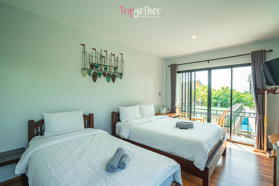 มาต่อกันที่ห้อง Two bedrooms ห้องพักน่ารักพื้นที่กระทัดรัด ที่จัดวางเฟอร์นิเจอร์ได้อย่างลงตัว และมีระเบียงส่วนตัวไว้ออกไปรับลมทะเลแบบชิลล์ๆ เหมาะกับการมากับแก๊งค์เพื่อนหรือครอบครัว รับรองว่าต้องอบอุ่นสุดๆ
