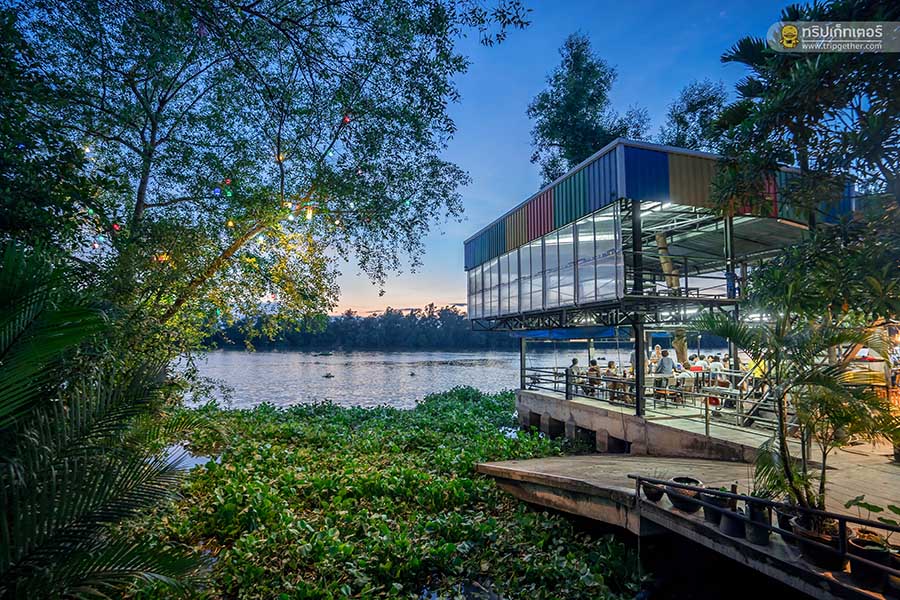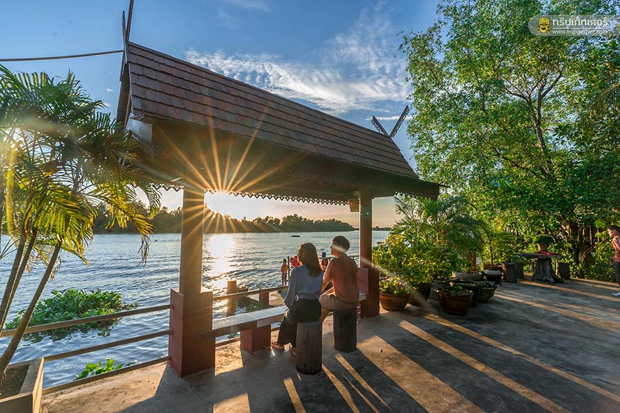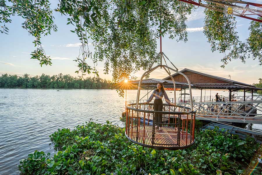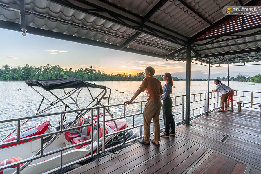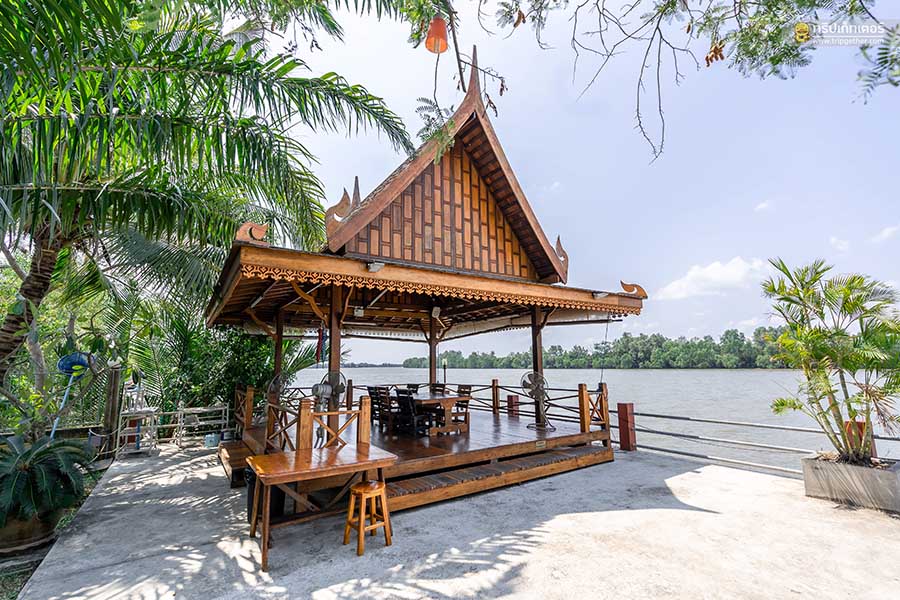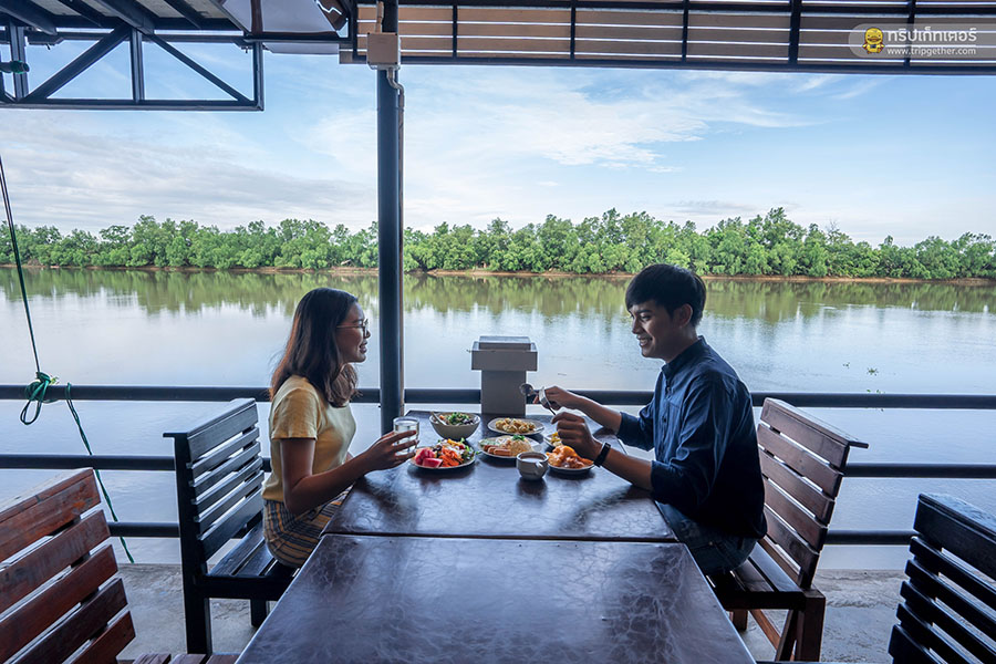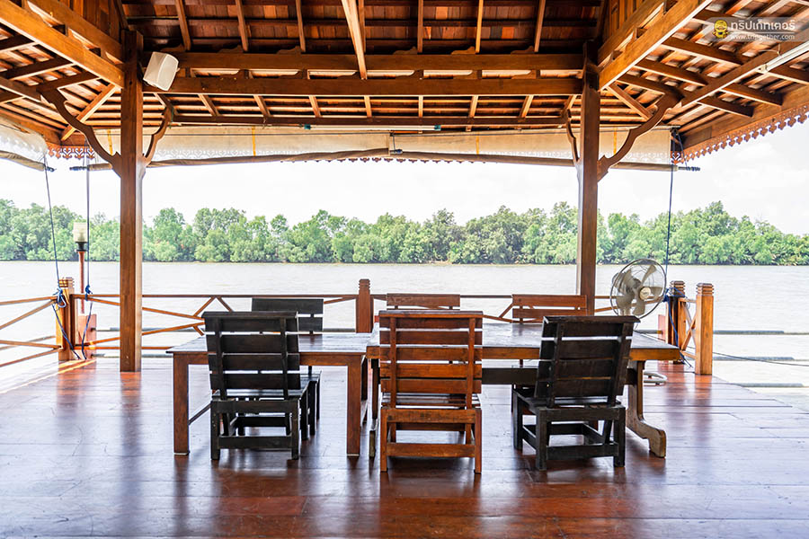 นอกจากนี้แล้ว บ้านนายถึกโฮมสเตย์ ยังมีโซนร้านอาหารริมน้ำที่เปิดให้บริการเวลา 09.00 – 19.00 น. (วันธรรมดา) และ 07.30 – 20.00 น. (วันศุกร์ – เสาร์และวันหยุดนักขัตฤกษ์) บอกเลยว่ายิ่งช่วงยามเย็นก็จะได้เห็นพระอาทิตย์ค่อยๆ ลับขอบฟ้าที่มีฉากด้านหน้าเป็นโค้งน้ำบางปะกง และแสงอาทิตย์ที่ส่องกระทบกับผิวน้ำยิ่งเพิ่มความสวยงามและโรแมนติกสุดๆ