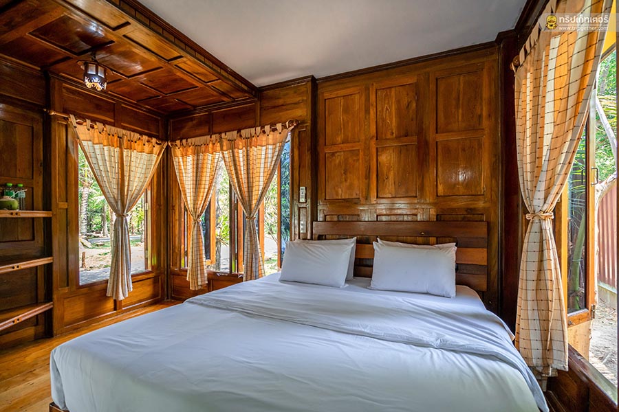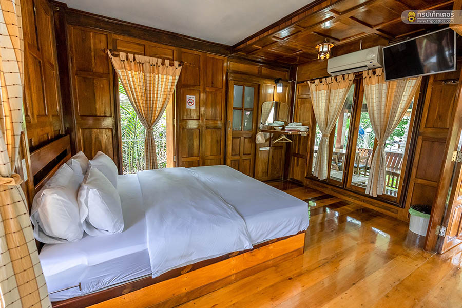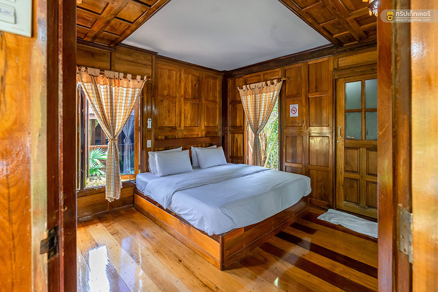 ภายในตัวบ้านก็ยังคงคอนเซ็ปต์ของการโชว์ความเป็นเนื้อไม้ได้เป็นอย่างดีตั้งแต่พื้นและพนังที่ตกแต่งด้วยไม้ สีอ่อนและเข้มของเนื้อไม้ช่วยเพิ่มความอบอุ่นและรู้สึกผ่อนคลายแถมยังให้ฟีลลิ่งของการพักผ่อนแบบอิงแอบแนบชิดกับธรรมชาติอีกด้วย พื้นที่ภายในห้องก็มีขนาดพอเหมาะสำหรับการพักผ่อน 2 – 3 คน และยังมีเตียงนอน Queen size ที่ตั้งอยู่ในสเปซที่สามารถมองวิวธรรมชาติผ่านหน้าต่างได้อย่างเต็มที่