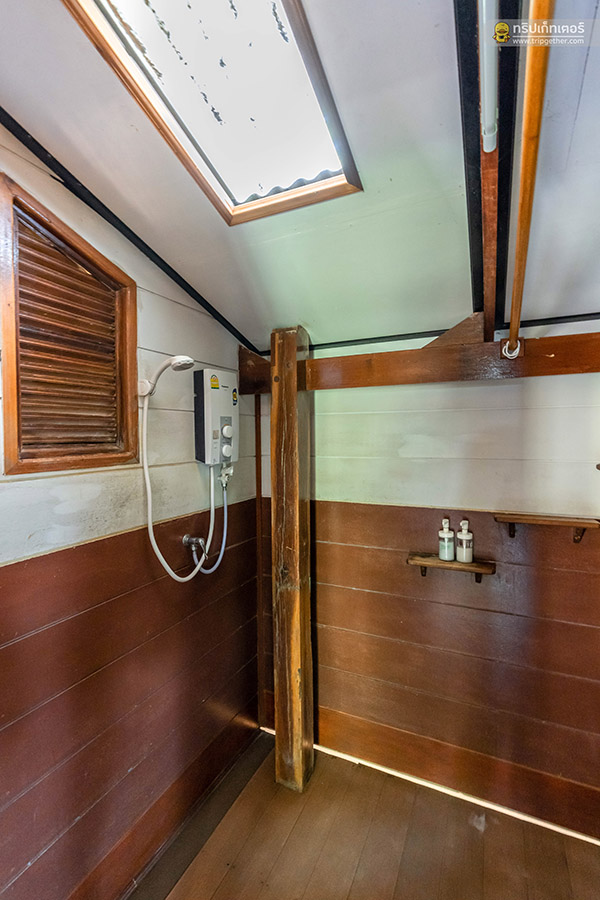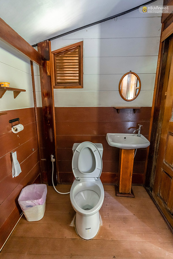 ภายในห้องน้ำยังตกแต่งด้วยไม้เพื่อให้เข้ากันกับภายในตัวบ้าน และเน้นการใช้สีน้ำตาลและสีขาวในการตกแต่ง พร้อมเครื่องทำน้ำอุ่นพร้อมฝักบัว Shower และยังมีกิมมิคเล็กๆ คือหลังคาโปร่งแสงที่ให้แสงจากธรรมชาติส่องผ่อนมาภายในตัวห้องน้ำได้