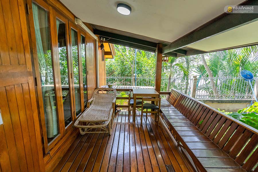 ด้านหน้าตัวบ้านยังมีระเบียงพร้อมที่นั่งและชุดโต๊ะทานอาหารไว้ให้นั่งพักผ่อนหย่อนใจ ทำกิจกรรมหรือจะมีนั่งรับลมเย็นๆ ที่พัดผ่านมุมนี้ตลอดทั้งวันก็ชิลล์สุดๆ
