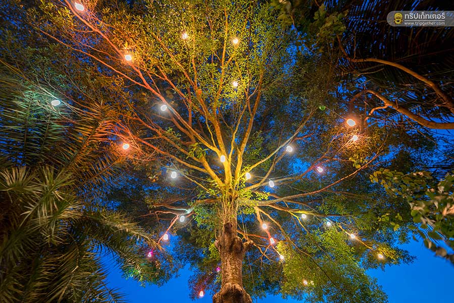 บรรยากาศยามค่ำคืนของ บ้านนายถึกโฮมสเตย์ ที่เต็มไปด้วยแสงไฟที่ห้อยประดับประดาอยู่ตามต้นไม้ยิ่งช่วยเพิ่มความโรแมนติกได้เป็นอย่างดี