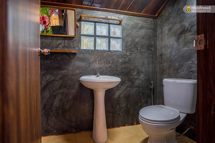 ภายในห้องน้ำยังคงตกแต่งด้วยสไตล์ลอฟท์และมีพื้นที่พอดีไม่คับแคบจนเกินไป แถมยังสะอาดสุดๆ