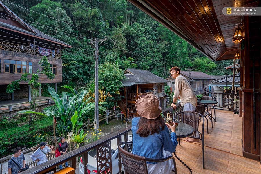 ด้านหน้าห้องยังมีระเบียงกว้างพร้อมชุดโต๊ะและเก้าอี้ให้นั่งชิลล์ ที่มุมระเบียงชั้นบนจะสามารถมองเห็นบรรยากาศของหมู่บ้านแม่กำปองที่ตอนเช้าจะได้เห็นถึงความคึกคัก ส่วนตอนเย็นจะได้เห็นถึงความสงบและสโลว์ไลฟ์