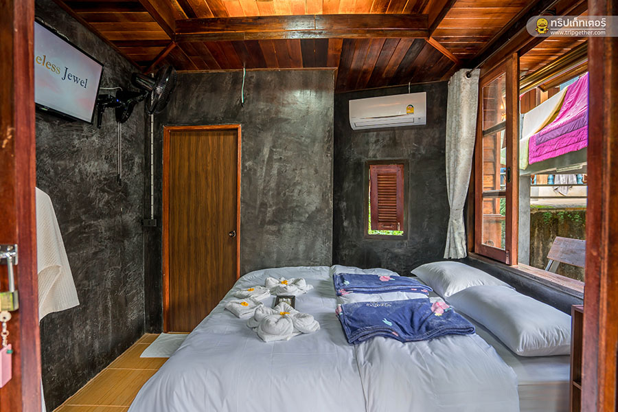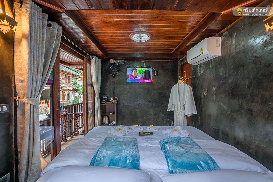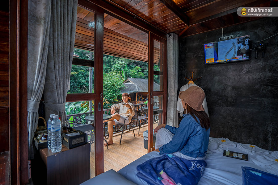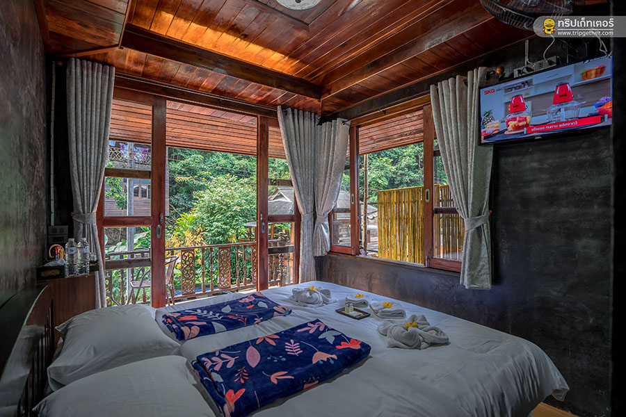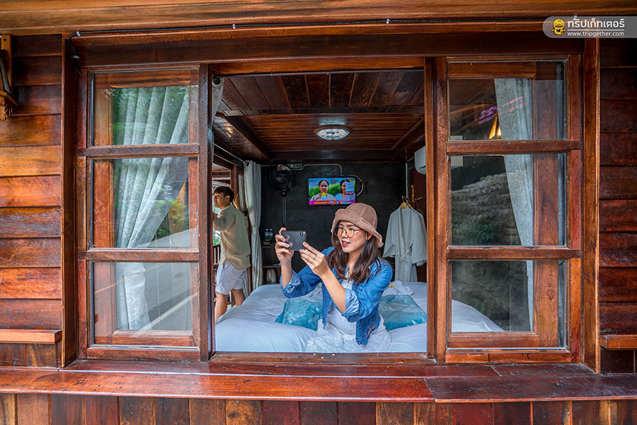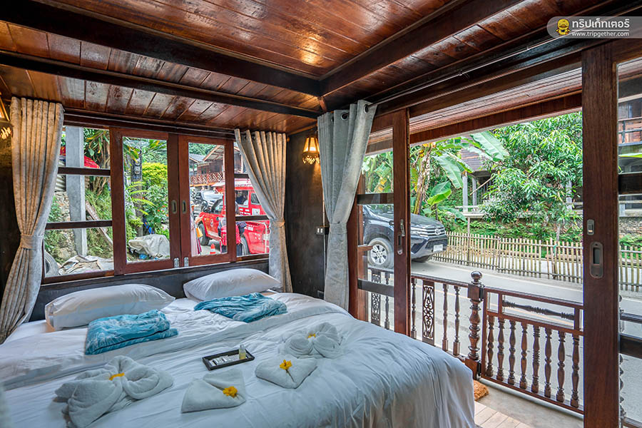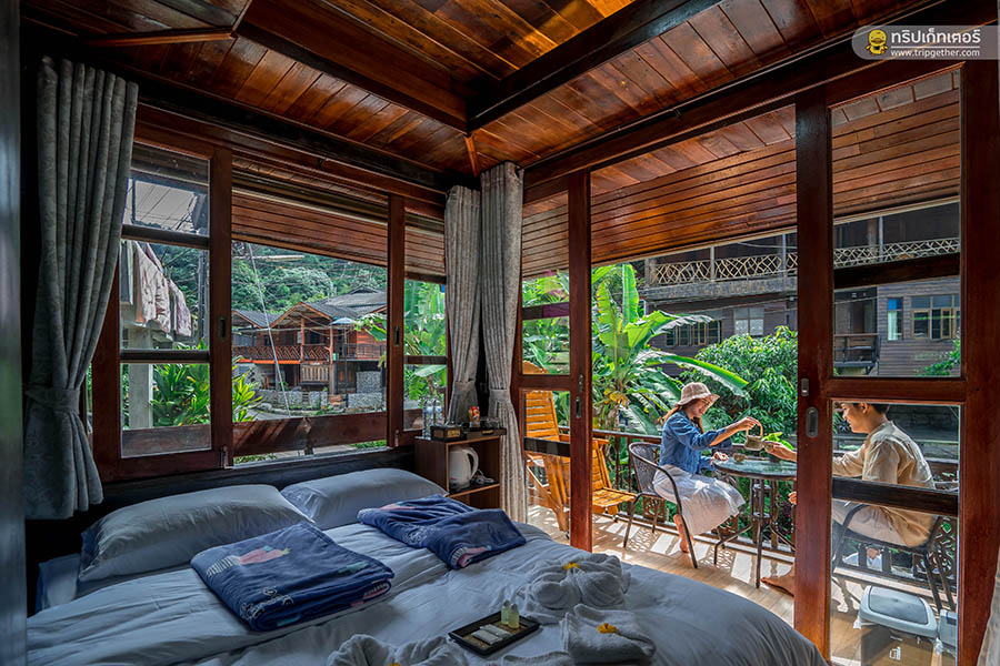 และยังมีหน้าต่างบานใหญ่อยู่ที่ปลายเตียงและประตูเลื่อนอยู่ที่หน้าห้องซึ่งสามารถเปิดรับลมเย็นได้อย่างเต็มที่ เรียกได้ว่านอนบนเตียงนุ่มๆ ชมวิวผ่านหน้าต่างได้จากบนเตียงกันเลยทีเดียว