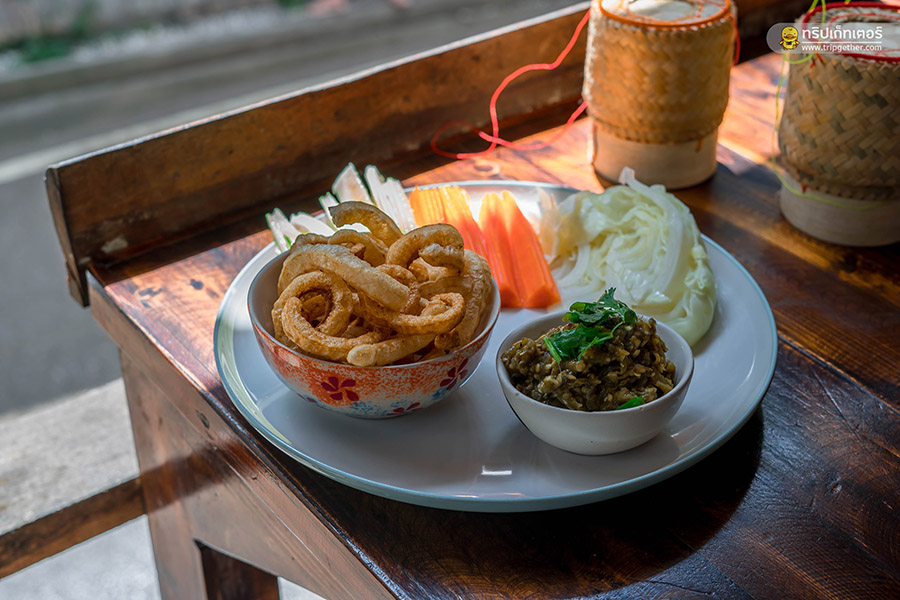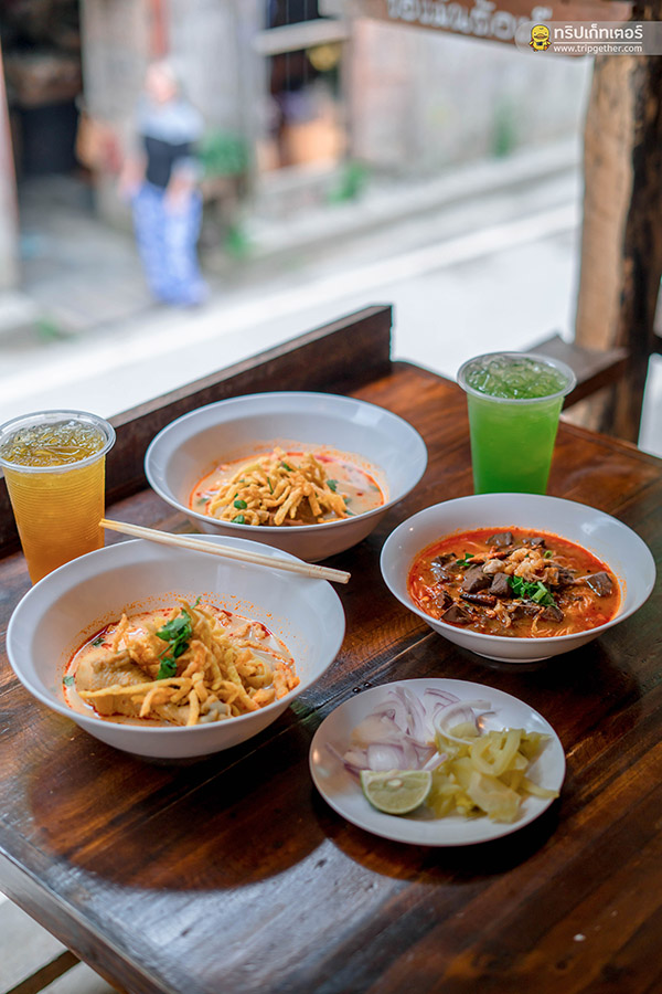 และสามารถนั่งทานได้ที่โซนร้าน ข้าวซอยกลอยใจ ซึ่งเช้านี้เราเลือกเป็น จิ้นส้มหมกไข่ แกงโฮะ แคบหมูน้ำพริกหนุ่ม และลาบคั่ว ส่วนเครื่องดื่มเลือกเป็น น้ำอัญชัญมะนาวและน้ำกระเจี๊ยบ