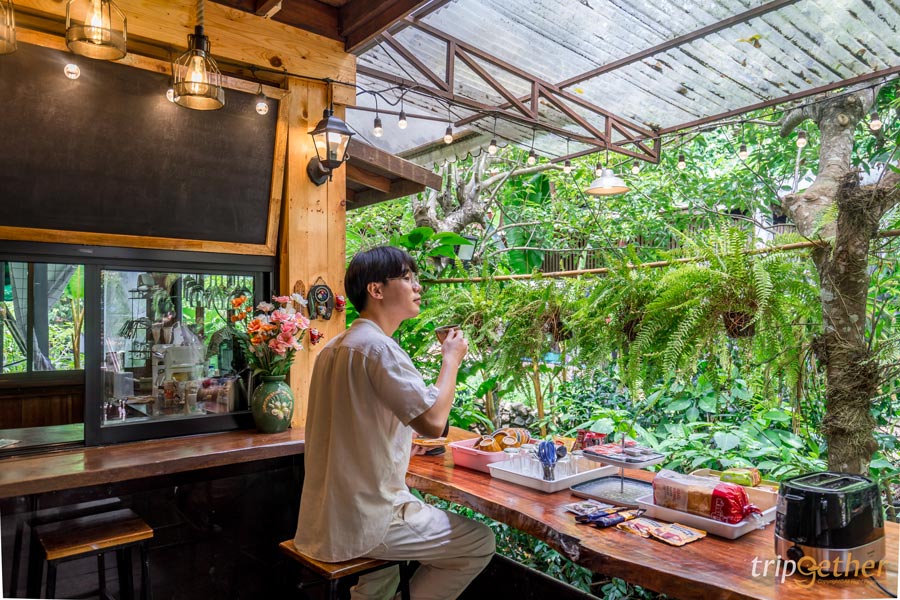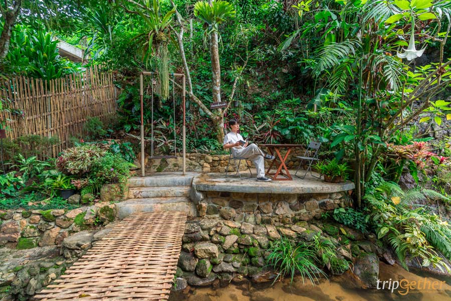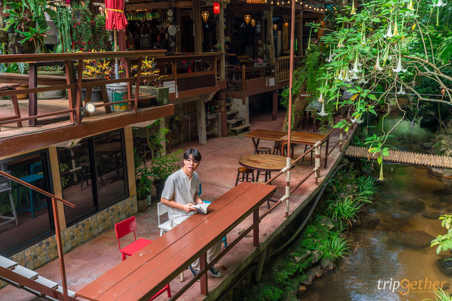 โซนริมน้ำที่มีทั้งที่นั่งแบบบาร์ โต๊ะเก้าอี้แบบครบชุด หรือจะข้ามสะพานไม้ไผ่เล็กๆ ไปนั่งอีกฝั่งที่ติดกับเนินเขาก็เป็นส่วนตัวสุดๆ
