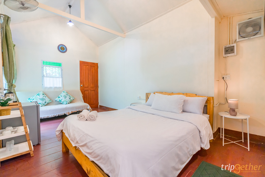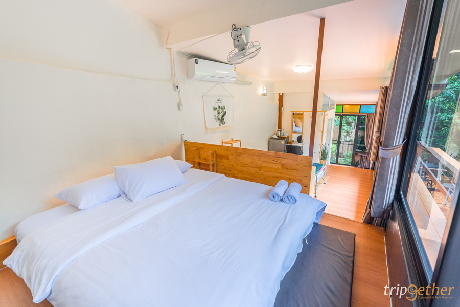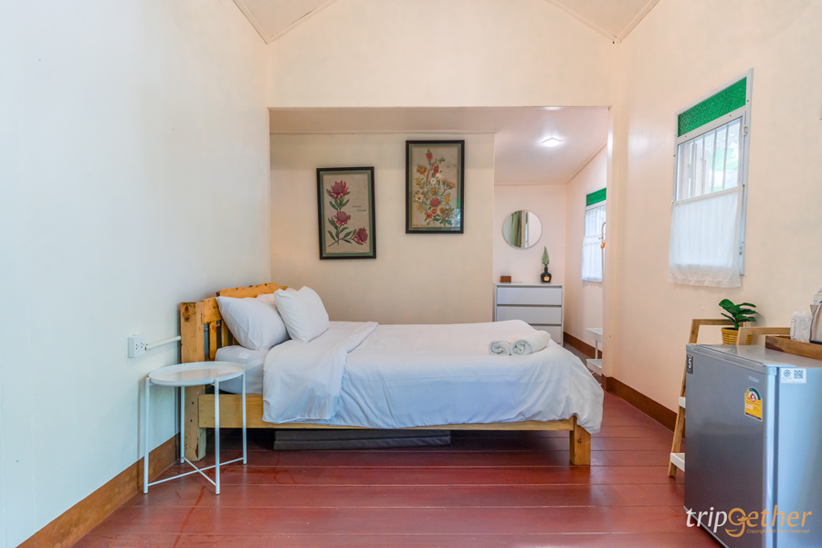 นอกจากบ้านพักแบบส่วนตัวเป็นหลังที่หลากหลายสไตล์แล้ว ที่บ้านพักเพลิน ยังมีห้องพักแยกออกเป็นห้องๆ ให้พักอีกด้วย โดยจะมีอยู่ทั้งหมด 4 ห้อง แบ่งออกเป็นห้องเพลิน 1, ห้องเพลิน 2, ห้องเพลิน 3 และห้องเพลิน 4 ซึ่งเราจะเริ่มกันกับห้องห้องแบบที่ 4 นั่นก็คือ ห้องเพลิน 1 กันก่อน