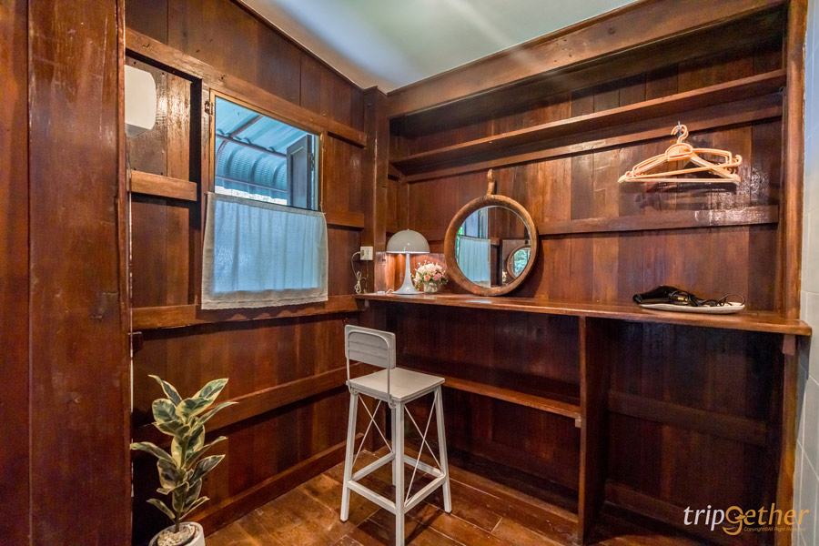 ด้านหน้าห้องน้ำยังเป็นส่วนของห้องแต่งตัว ที่มีโต๊ะเครื่องแป้งแบบบาร์เก๋ๆ พร้อมกับโคมไฟและกระจกให้พร้อม ในส่วนของห้องน้ำก็แบ่งโซนแห้งและเปียกได้เป็นอย่างดี สะดวกสบายสุดๆ