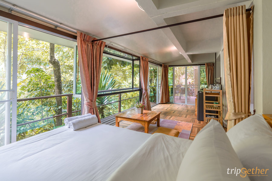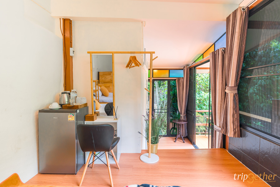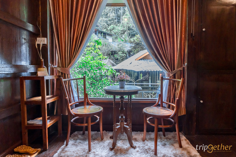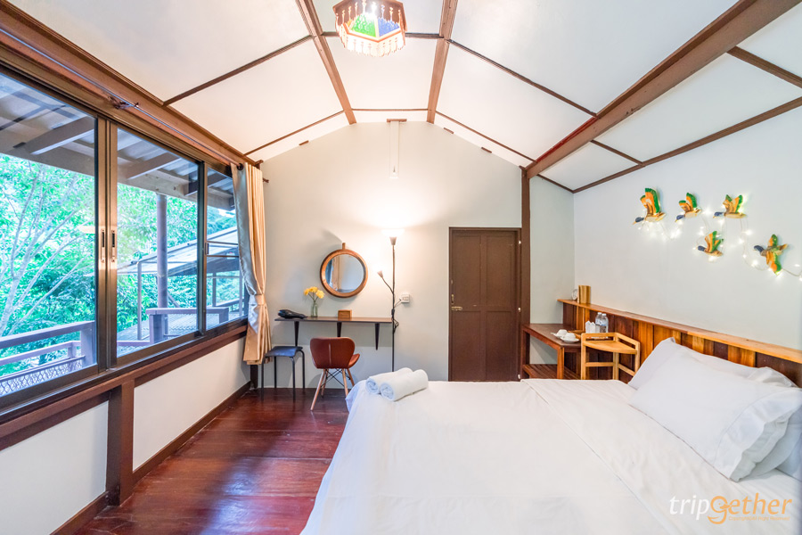 เมื่อเข้าไปในห้อง ก็จะให้บรรยากาศและความรู้สึกแตกต่างออกไปจากตอนที่อยู่ด้านนอก เพราะภายในตกแต่งและออกแบบรูปทรงฝ้าเพดาน รวมทั้งการใช้โทนสีเน้นไปทางความเป็นยุโรป เหมือนได้มาพักบ้านพักตากอากาศในชนบทต่างประเทศยังไงอย่างงั้น แถมด้านที่หันออกจากแนวเขายังมีหน้าต่างบานใหญ่ให้มองเห็นด้านนอกได้แบบเต็มๆ
