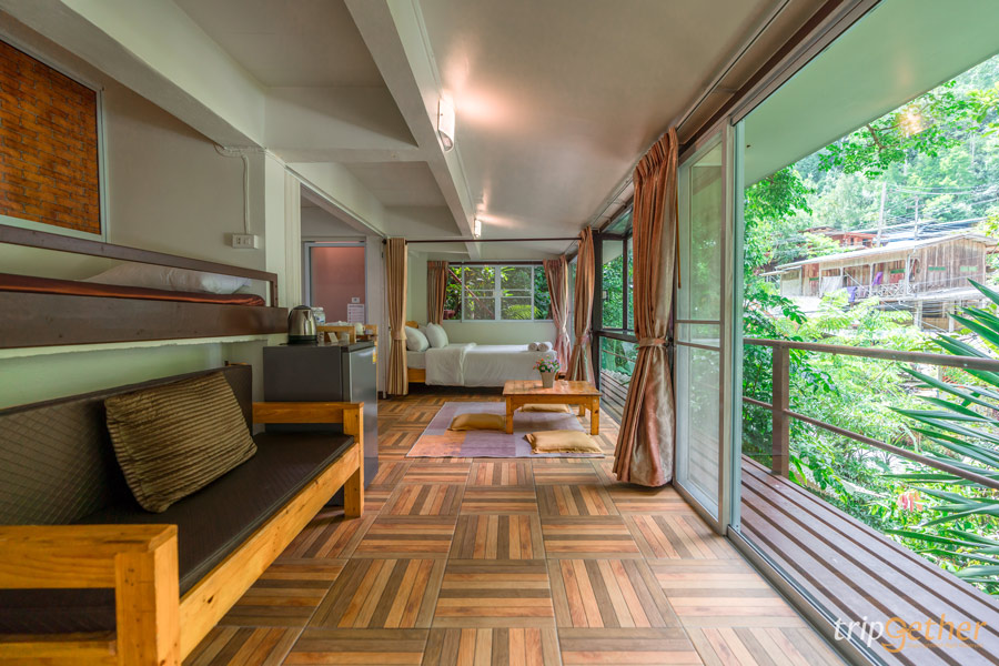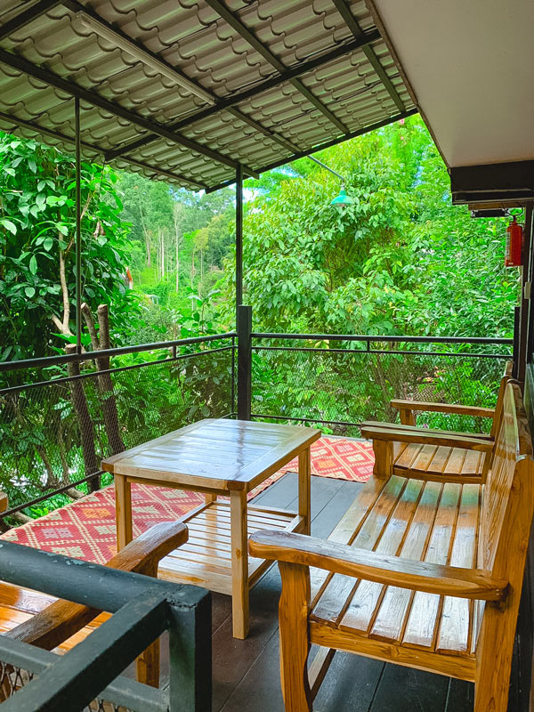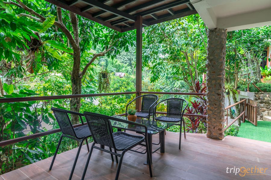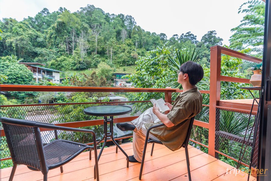 นอกจากนี้ด้านหน้าห้อง ยังมีระเบียงพร้อมด้วยโต๊ะเก้าอี้สบายๆ พร้อมกับวิวตัวหมู่บ้านและภูเขาแบบไม่มีอะไรมากั้น บอกเลยว่าออกมานั่งเล่นรับลมเย็นๆ ฟินไม่ไหว