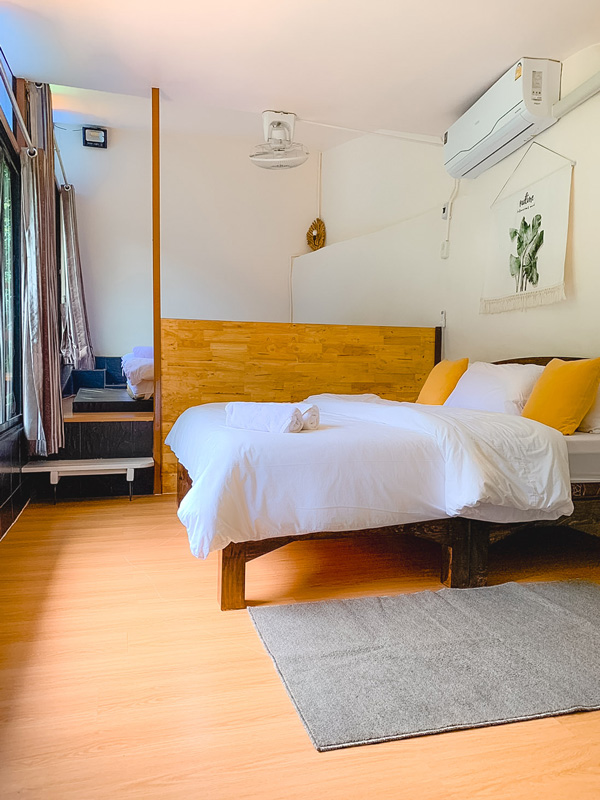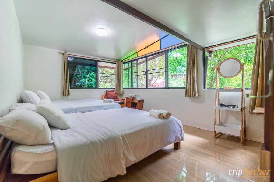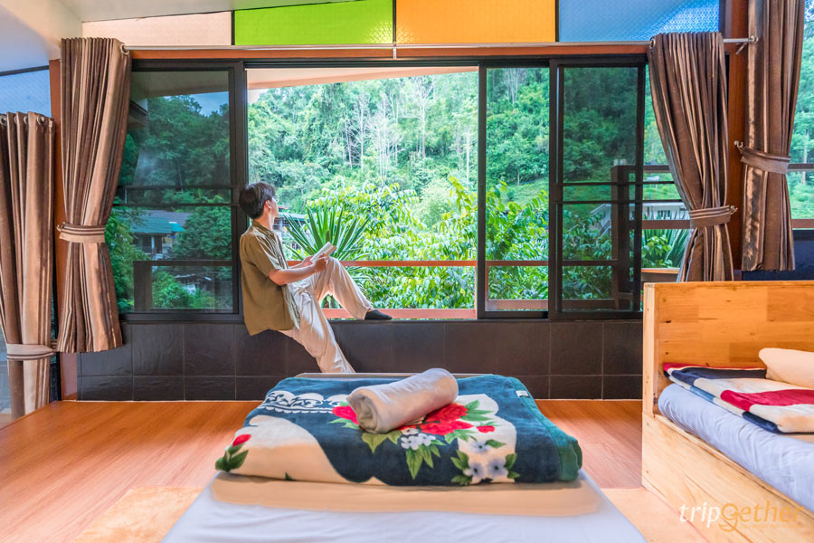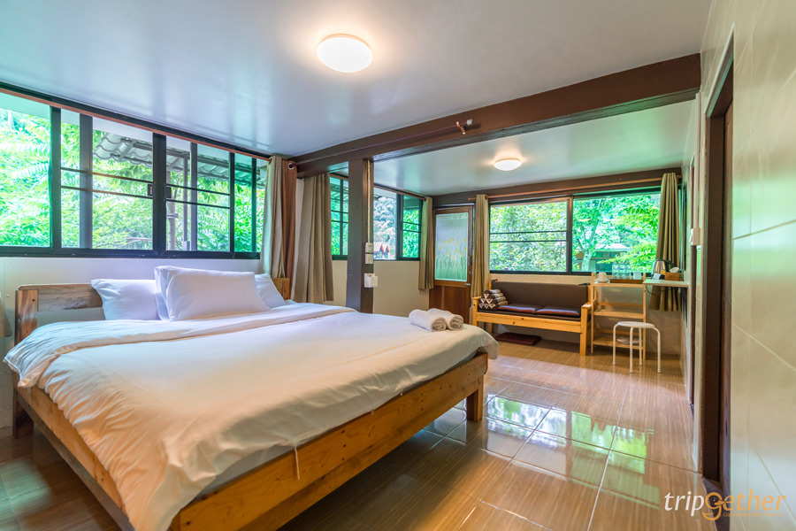 ห้องพักเพลิน 1 จะแบ่งออกเป็น 2 เตียงใหญ่ที่หันหน้าออกทางกระจกใส และมีเบาะนอนเล็กๆ ที่ยกสูงอยู่ด้านทางเข้าห้อง และกลางห้องยังมีที่นั่งแบบโต๊ะญี่ปุ่นและเบาะนุ่มให้นั่งรับลมชมวิวสวยๆ อีกด้วย