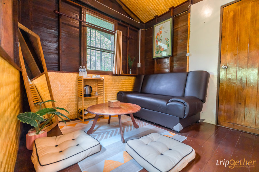 นอกจากนี้ด้านหน้าห้องก็ยังมีที่นั่งแบบโอเพ่นติดแนวไม้ เหมาะกับการออกมานั่งเล่น สูดอากาศแบบสุดๆ