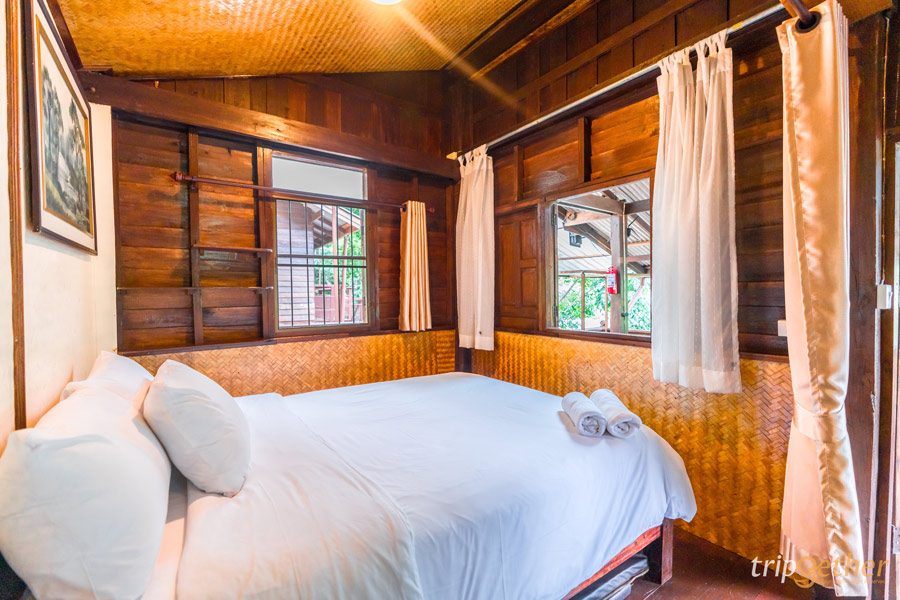 ถัดมาเป็นห้องแบบที่ 6 คือห้องเพลิน 3 เป็นห้องพักขนาดเล็กน่ารัก เหมาะกับการมาพักคนเดียวหรือมาเป็นคู่ การตกแต่งและบรรยากาศภายในห้อง บอกเลยว่าให้ความรู้สึกกลิ่นอายแบบบ้านเรือนในภาคเหนือสุดๆ เพราะนอกจากจะมีฝาผนังเป็นไม้แล้ว ยังตกแต่งผนังและเพดานด้วยการใช้ไม้ไผ่สานอีกด้วย
