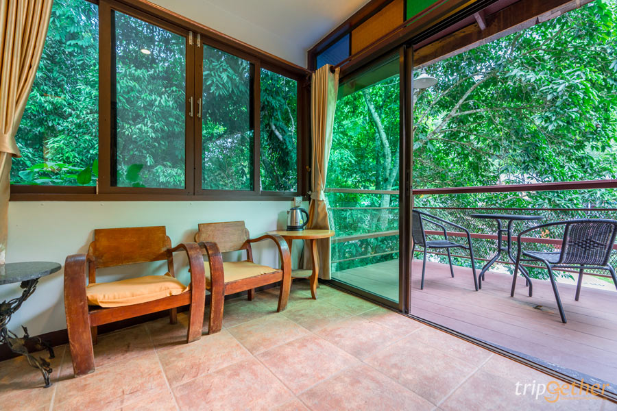 มาต่อกันกับห้องแบบที่ 5 อย่างห้องเพลิน 2 ซึ่งเป็นห้องที่อยู่ชั้นบนในบ้านหลังเดียวกับห้องเพลิน 1 ส่วนแรกของห้องนี้จะเป็นส่วนของระเบียงที่มีพื้นที่กว้าง พร้อมกับที่นั่งแบบโต๊ะเกี้าอี้ด้านหน้าห้องที่ห้อมล้อมไปด้วยความกรีนของยอดไม้