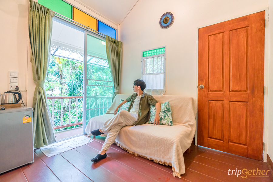 นอกจากนี้ยังมีโซฟาหลังขนาดกำลังดี อยู่ติดริมระเบียงให้ได้นั่งชมวิวความกรีน ฟังเสียงน้ำไหลเอื่อยๆ ด้านนอกได้แบบสบายๆ หรือจะออกมานั่งรับลมด้านนอกก็ดีไม่แพ้กัน
