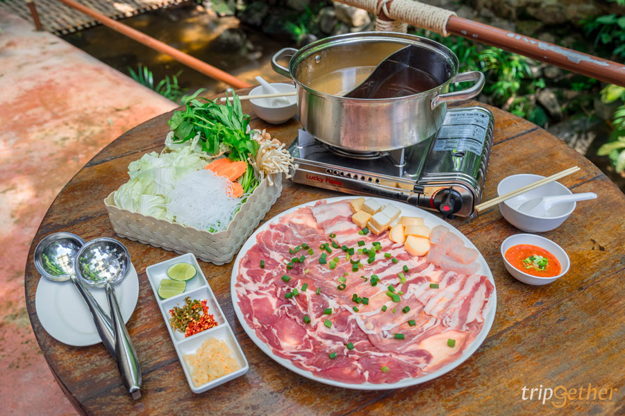 อาหารเย็นมีทั้งชุดชาบูร้อนๆ ที่เสิร์ฟมาแบบจัดเต็มทั้งหมูสไลซ์ เต้าหู้ ปลา ผักหลากหลายชนิด พร้อมด้วยน้ำจิ้มและเครื่องปรุงสุดจัดจ้าน แถมน้ำซุปยังมีให้ถึง 2 แบบ คือน้ำใสและชาบูน้ำดำ อากาศเย็นๆ นั่งกินริมน้ำ บอกเลยว่าฟิน โดยชุดชาบูจะรวมอยู่ในแพ็คเกจที่พักพร้อมอาหารเช้าและเย็น
