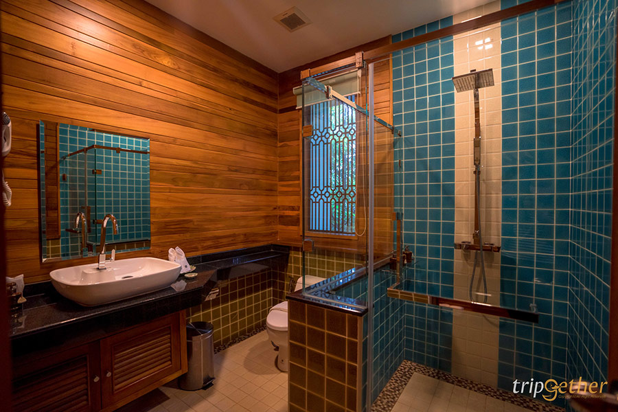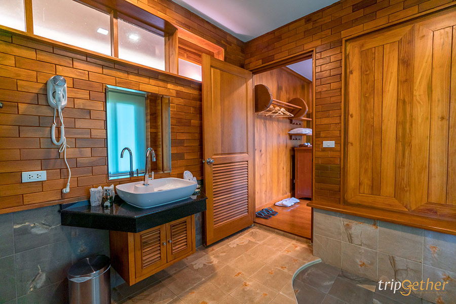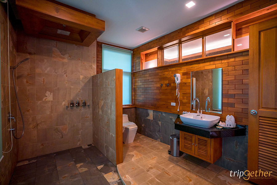 ห้องน้ำกว้างขวาง แบ่งโซนแห้งและโซนเปียก ภายในมีหน้าต่างกระจกใสให้รับแสงจากธรรมชาติเข้ามาในห้องด้วย แต่ถ้าใครต้องการความเป็นส่วนตัวเพิ่มมากขึ้น ก็สามารถเลื่อนม่านมาปิดได้