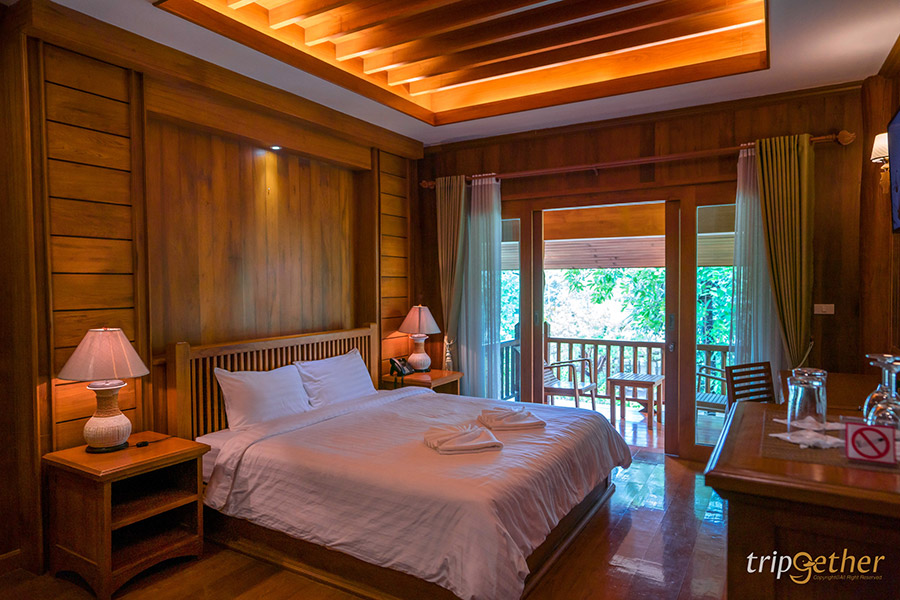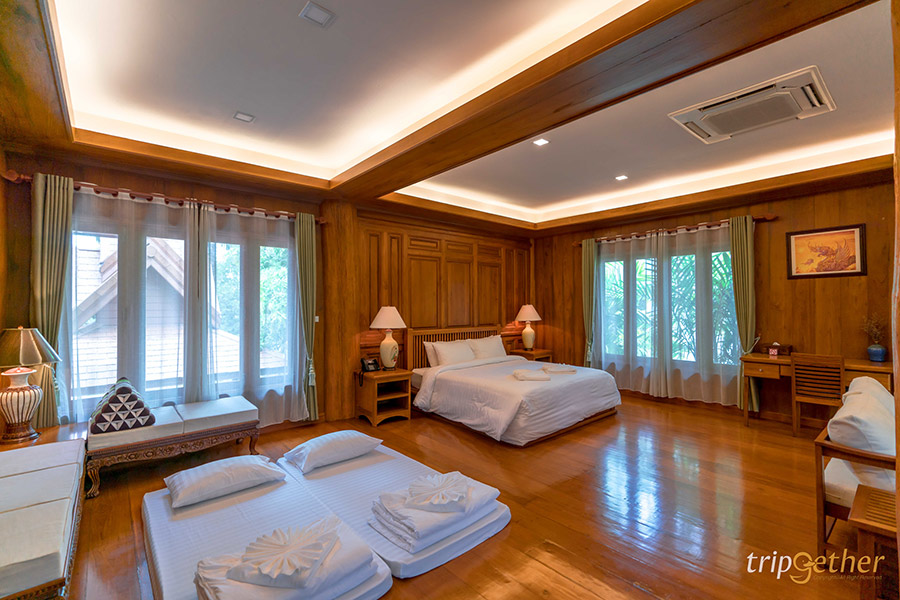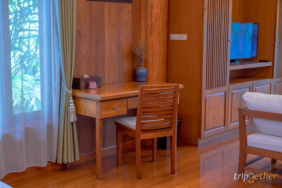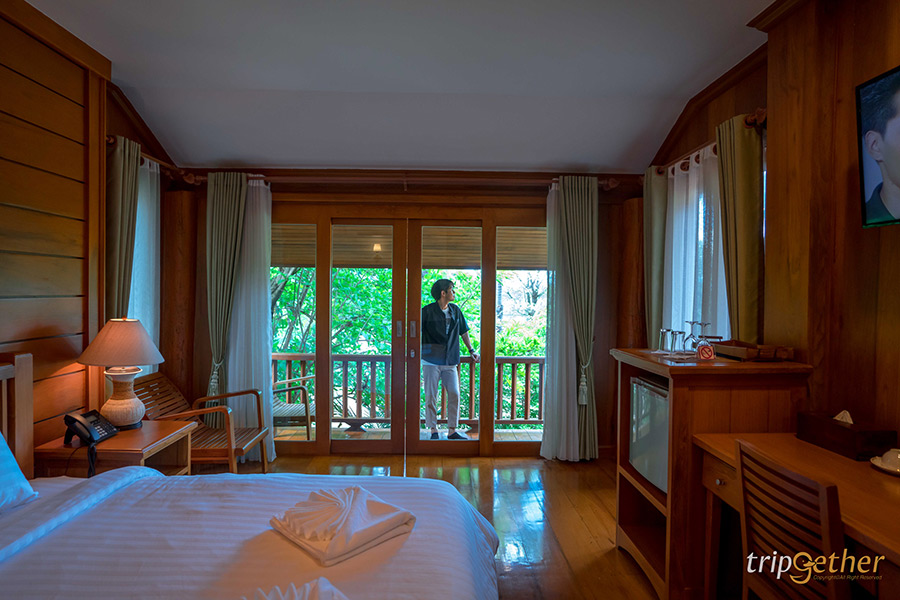 หลังจากเช็คอินและเดินเล่นรอบๆ กันเรียบร้อยแล้ว เราก็จะพาทุกคนมาเยี่ยมชมห้องพักของที่นี่กัน ที่นี่มีห้องพักทั้งหมด 9 ห้อง แบ่งเป็น 2 รูมไทป์ด้วยกัน แบบแรกคือ Deluxe Room และแบบที่สองคือห้อง Vanasin Suite ซึ่งห้องไทป์นี้มีแค่ห้องเดียวเท่านั้น เราจะเริ่มจากห้อง Deluxe Room เป็นห้อง Standard ของที่นี่ รองรับผู้เข้าพักได้ 2 คน สามารถเสริมที่นอนเพิ่มได้ มีกระจกบานใหญ่ให้มองวิวจากในห้อง ภายในห้องตกแต่งอย่างสวยงาม เน้นใช้เฟอร์นิเจอร์ไม้เพื่อให้เข้ากับบรรยากาศของที่พัก ถึงแม้จะเป็นห้องเล็กสุดของที่นี่ แต่ข้างในกว้างขวางพอสมควรและไม่อึดอัดเลย มีอุปกรณ์อำนวยความสะดวกต่างๆ ครบถ้วน ทั้งเครื่องปรับอากาศ โทรทัศน์ ตู้เย็น และกาน้ำร้อนไฟฟ้าพร้อมมินิบาร์
