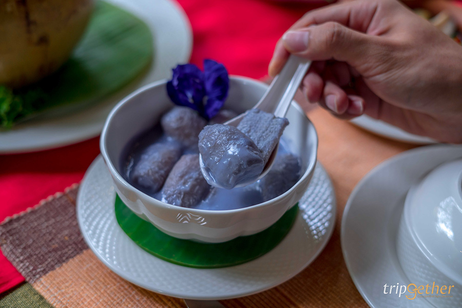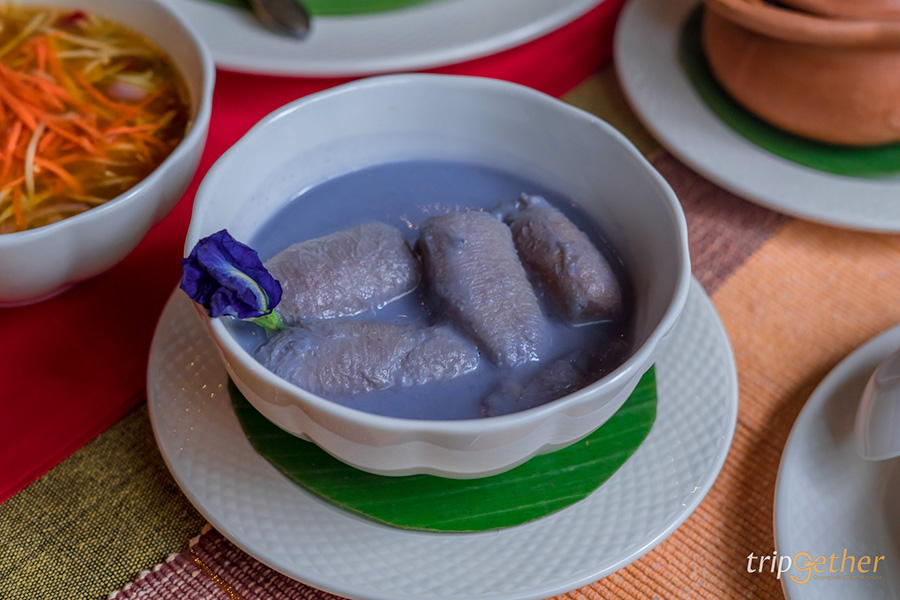 และตบท้ายมื้อเย็นด้วยเมนูของหวาน กล้วยบวชชีดอกอัญชัน หวานกลมกล่อมสุดๆ ถ้วยละ 40 บาท