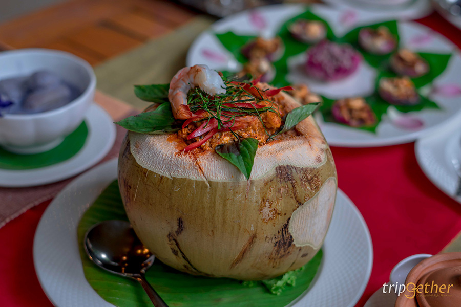 ต่อกันที่เมนูห่อหมกทะเลมะพร้าวอ่อน เสิร์ฟมาในลูกมะพร้าว จัดจานมาอย่างสวยงาม รสชาติจัดจ้านถึงเครื่องแกง แถมให้กุ้งตัวโตและหมึกเยอะมาก คุ้มค่ากับราคาสุดๆ เพียง 200 บาทเท่านั้น