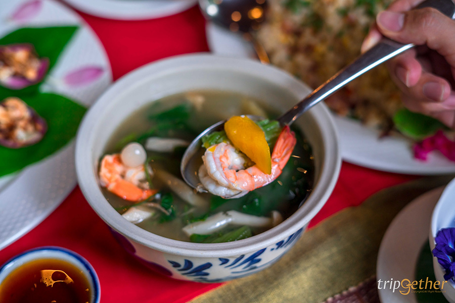 แกงเลียงกุ้งสด กุ้งตัวใหญ่เนื้อแน่นเสิร์ฟมาในน้ำแกงรสชาติเผ็ดอ่อนๆ เป็นเมนูที่เหมาะกับคนรักสุขภาพ เพราะมีผักเยอะมาก แถมหอมกลิ่นพริกขี้หนูสุด เมนูนี้ห้ามพลาดเด็ดขาด ราคาอยู่ที่ 200 บาท