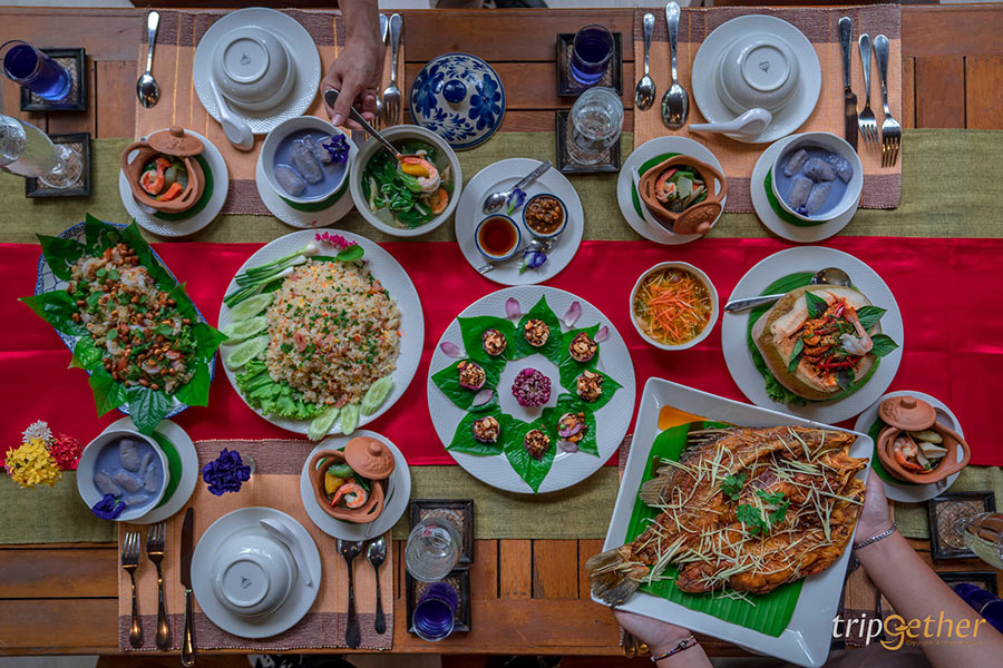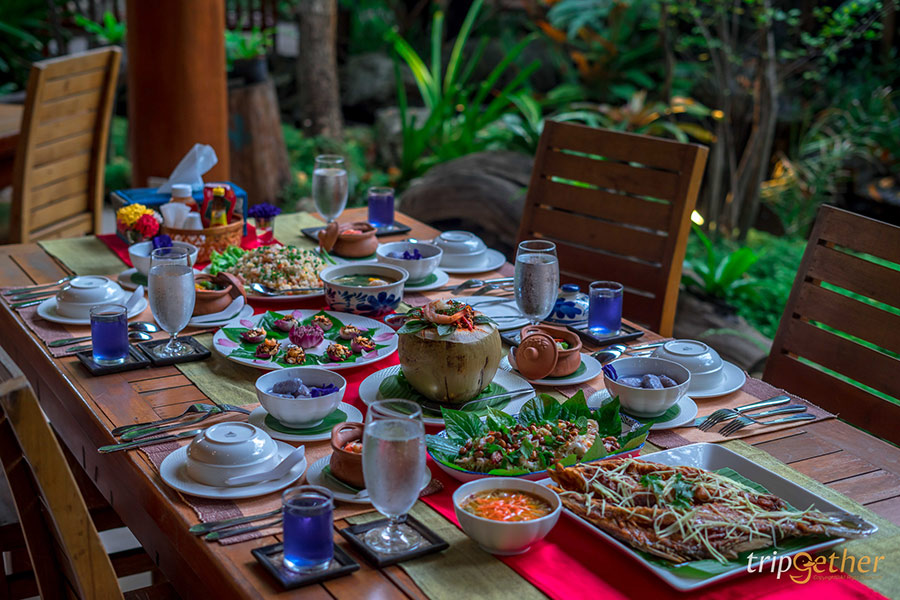 หลังจากเช็คอินและพักผ่อนตามอัธยาศัยในห้องพักเสร็จแล้ว เรามาต่อกันที่ “ห้องอาหารวรรณคดี” ร้านอาหารไทยที่อยู่ในบริเวณบ้านพัก ตั้งอยู่ด้านหลังล็อบบี้ ข้างๆ น้ำตกจำลอง เรียกได้ว่าไม่ต้องออกไปหามื้อเย็นที่ไหนไกลเลย เพราะบ้านวนาสินมีให้ครบทุกอย่าง