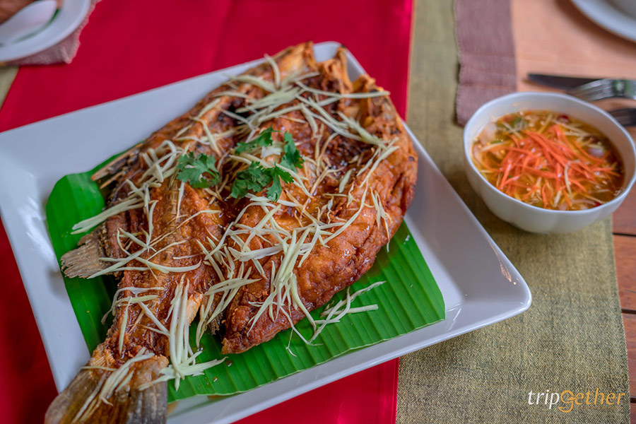 มาต่อกันที่เมนูของทอดกันบ้าง อย่างเมนูปลากะพงราดน้ำปลา ปลากะพงเนื้อแน่นตัวใหญ่ทอดกรอบ ราดด้วยน้ำยำรสชาติเปรี้ยวหวาน ออกมาน่ากินสุดๆ จานนี้ราคา 350 บาท