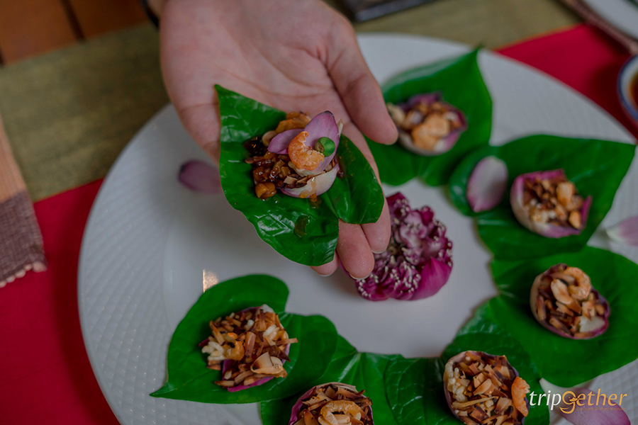 ปิดท้ายเมนูของคาวด้วย เมี่ยงคำวนาสิน เป็นเมนูไฮไลท์ของที่นี่เลย เพราะปรุงรสด้วยสูตรเฉพาะของทางร้าน หอมกลิ่นมะพร้าวคั่วสุดๆ กินพร้อมกับน้ำจิ้มหวานและน้ำจิ้มเต้าเจี้ยว รับรองว่าหากินที่ไหนไม่ได้แน่นอน ราคาเพียง 100 บาทเท่านั้น
