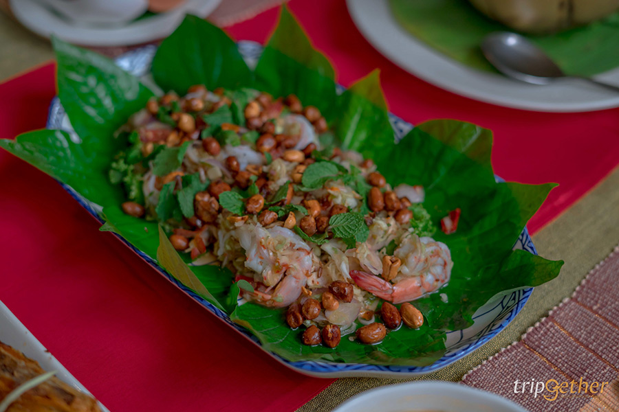 ยำตะใคร้กุ้งสด เมนูนี้หอมกลิ่นตะใคร้มาก เสิร์ฟพร้อมกุ้งตัวใหญ่เต็มคำหลายตัว จานนี้รสชาติครบรสมาก ราคา 180 บาท