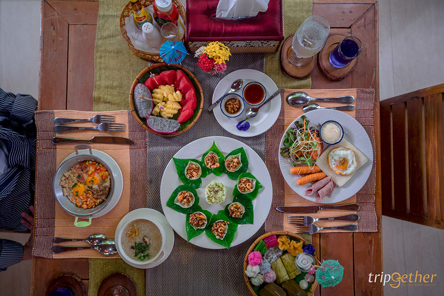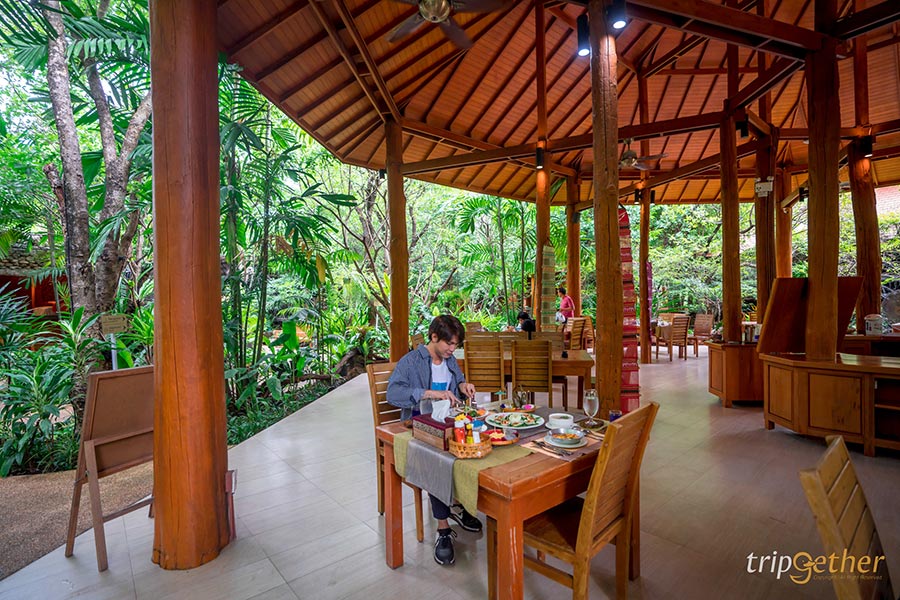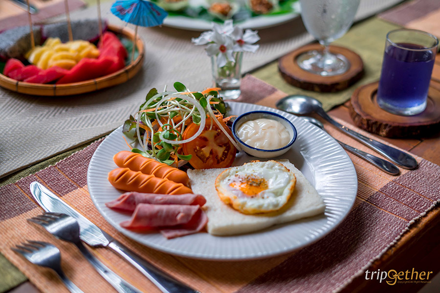 สำหรับมื้อเช้าของทางที่พักเริ่มกินได้ตั้งแต่เวลา 8.00 น. ที่ห้องอาหารวรรณคดีเลย เซ็ตอาหารเช้าของที่นี่จะมีทั้งอเมริกันเบรกฟาสต์ ข้าวต้ม และไข่กระทะ ซึ่งเซ็ตอาหารอาจจะแตกต่างกันไปในแต่ละวัน โดยจะเสิร์ฟพร้อมเมี่ยงคำวนาสิน เซ็ตขนมไทยหลากหลายแบบ และผลไม้ตามฤดูกาล บอกเลยว่าอิ่มคุ้มมาก