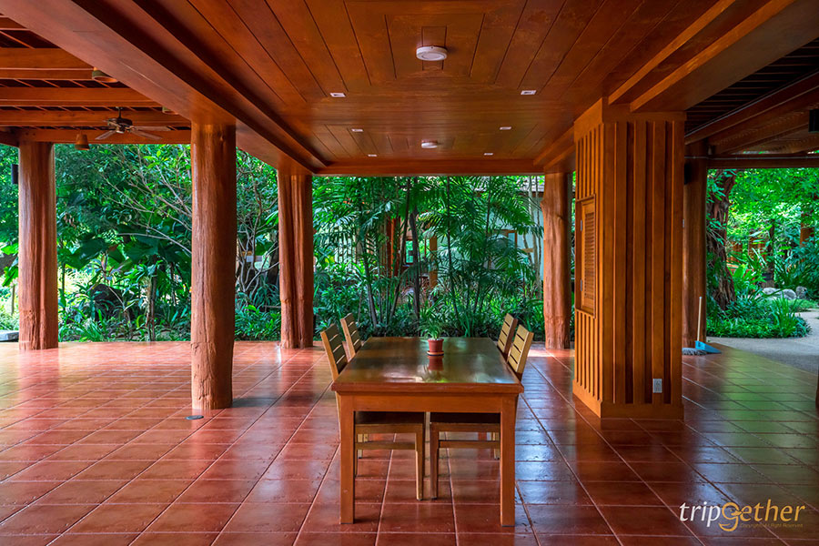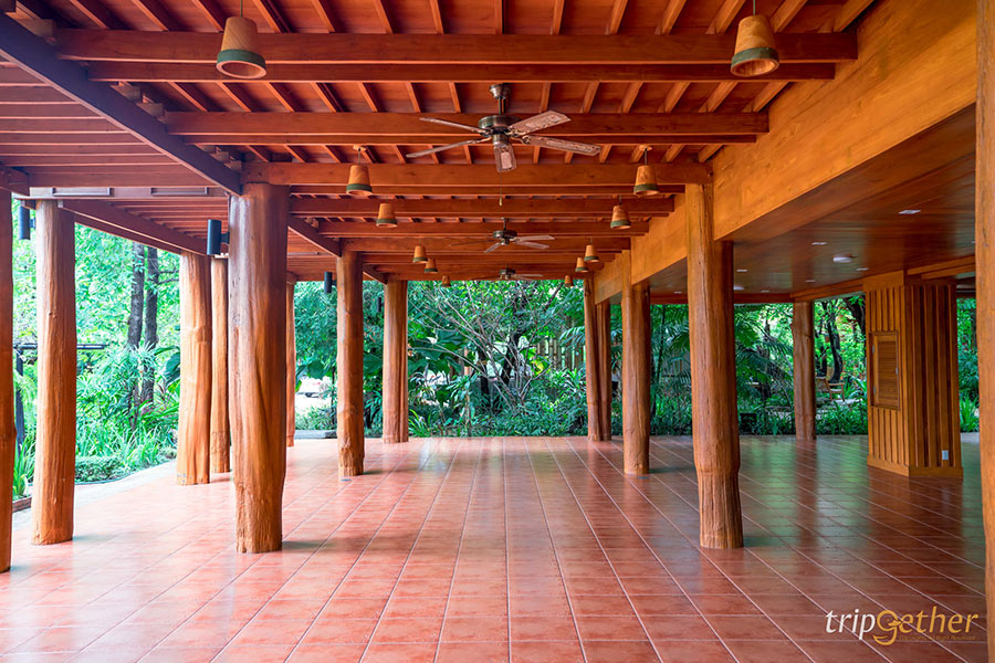 ด้านล่างอาคารที่พักแต่ละหลังออกแบบให้เป็นโถงกว้างๆ มีที่นั่งให้มานั่งเล่น หรือจะเดินถ่ายรูปกับสถาปัตยกรรมสวยงามของที่นี่ก็ได้