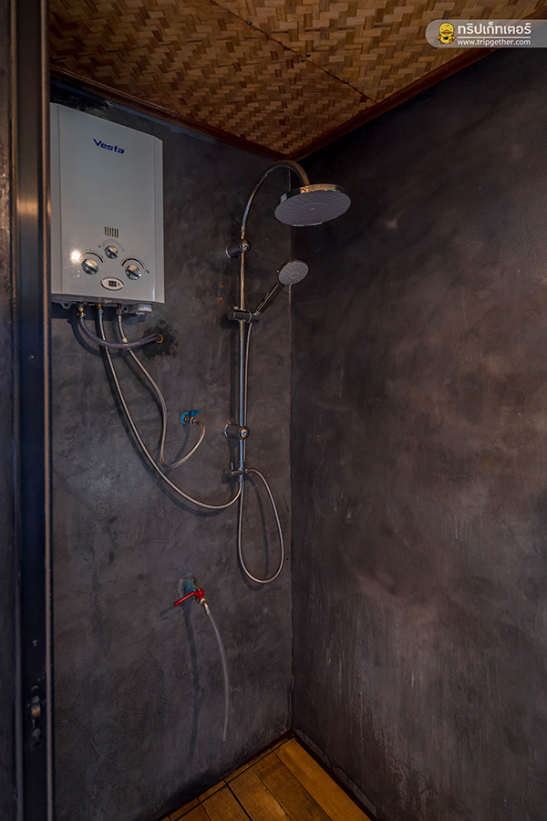และยังมีห้องน้ำส่วนตัวที่ด้านข้างตัวเต็นท์แบบที่เรียกได้ว่าสะดวกสบายสุดๆ เพราะภายในห้องน้ำมีทั้งเครื่องทำน้ำอุ่นระบบแก๊ส อีกทั้งยังมีครีมอาบน้ำและแชมพูไว้ให้อีกด้วย