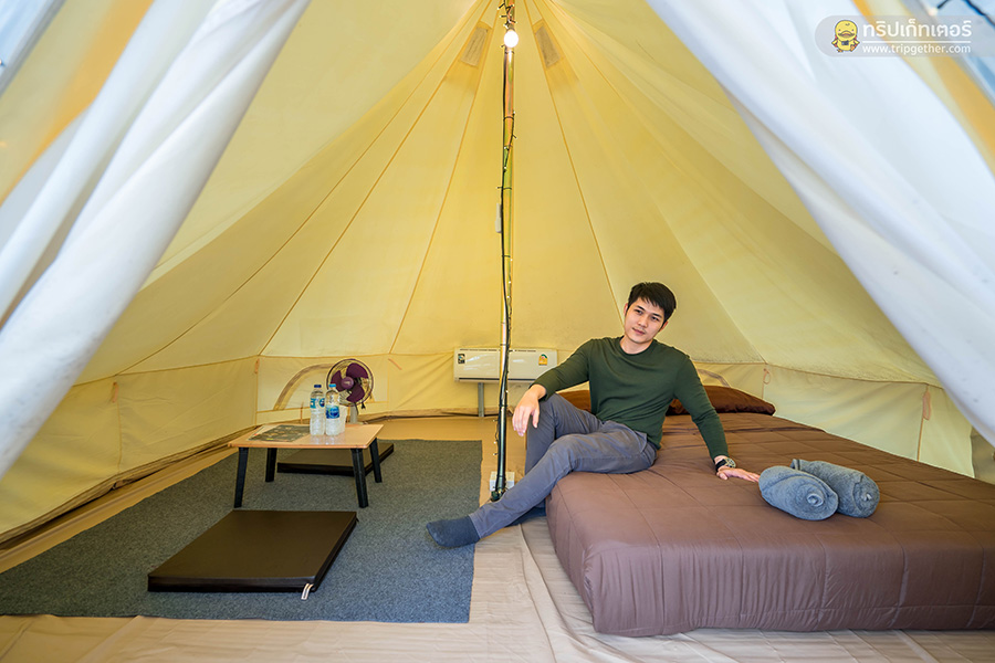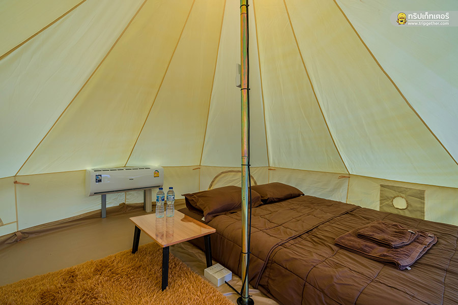ภายในตัว เต็นท์กระโจมติดแอร์ VIP มีพื้นที่พอเหมาะสำหรับเข้าพัก 2 – 3 คน พร้อมที่นอนขนาด 5 ฟุต และพิเศษสุดๆ ด้วย เครื่องปรับอากาศ ที่ไม่ว่าจะอยู่ในเต็นท์ตอนไหนก็เย็นฉ่ำได้ทั้งวัน นอกจากนี้แล้วยังมีน้ำดื่มและผ้าเช็ดตัวให้อีกด้วย