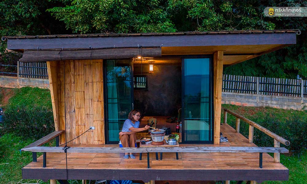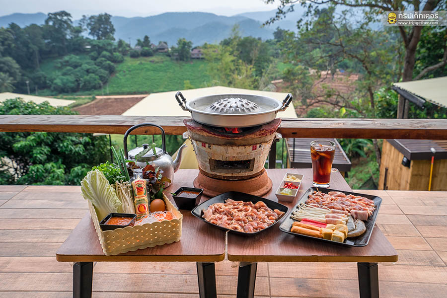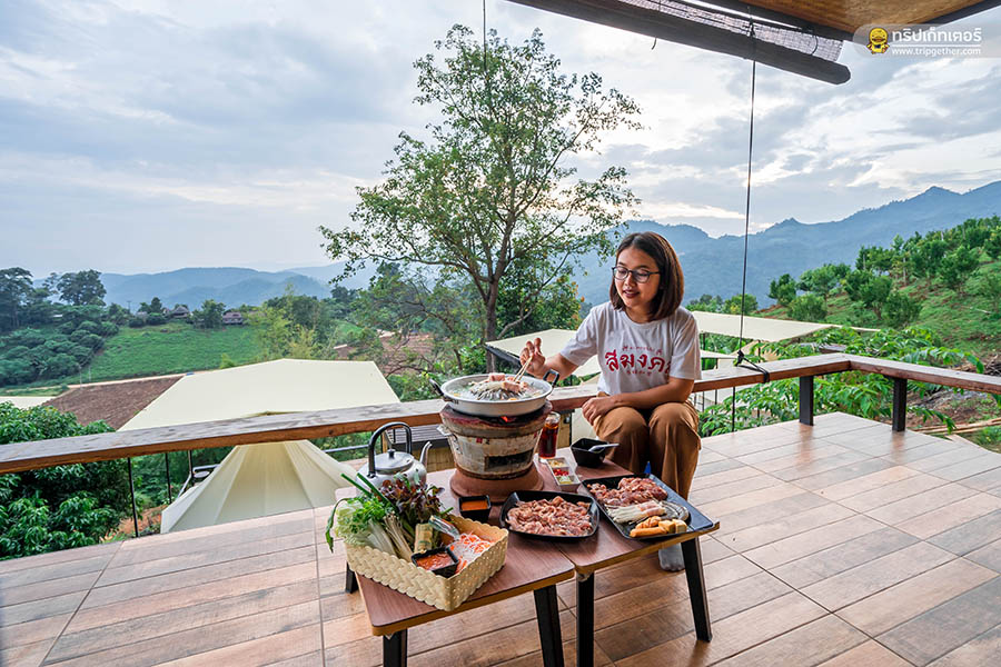 ในช่วงเย็นก็คงไม่มีอะไรฟินไปกว่าการปิ้งย่างหมูกระทะกินที่หน้าห้องพักพร้อมกับชมแสงทไวไลท์จากพระอาทิตย์ท่ามกลางลมหนาว